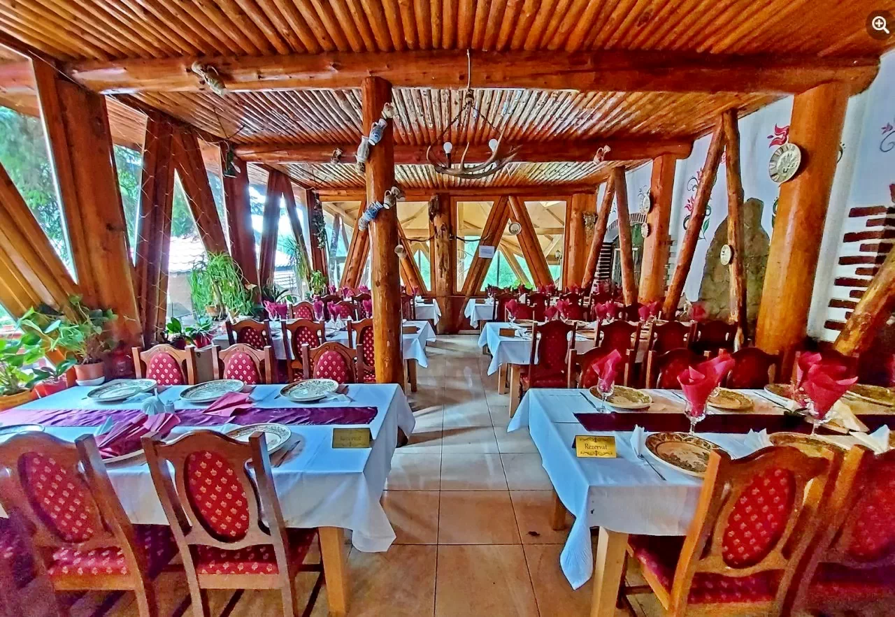 - Dispune de un restaurant pentru 50 persoane, terasa acoperita cu 100 locuri, terasa in stil rustic cu 30 locuri, sala rustica cu 30 locuri si de o gradina de vara cu 20 locuri.