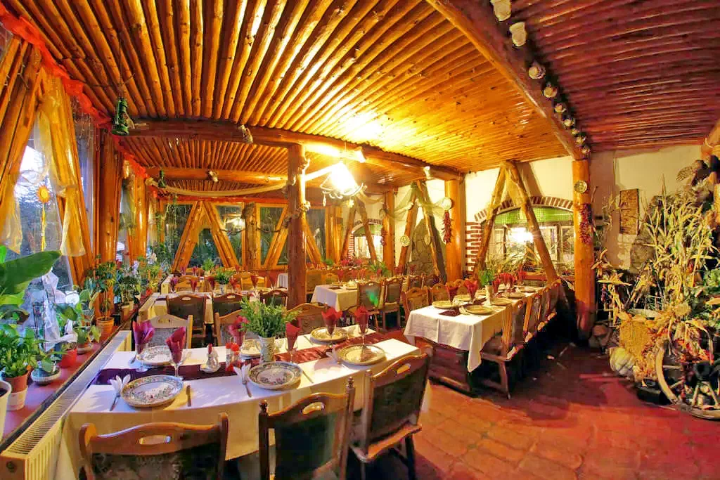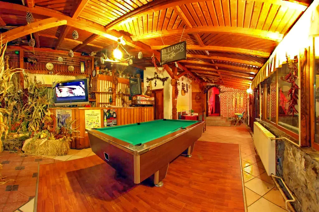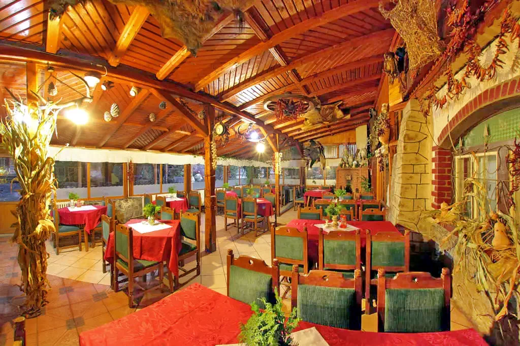 - Dispune de un restaurant pentru 50 persoane, terasa acoperita cu 100 locuri, terasa in stil rustic cu 30 locuri, sala rustica cu 30 locuri si de o gradina de vara cu 20 locuri.