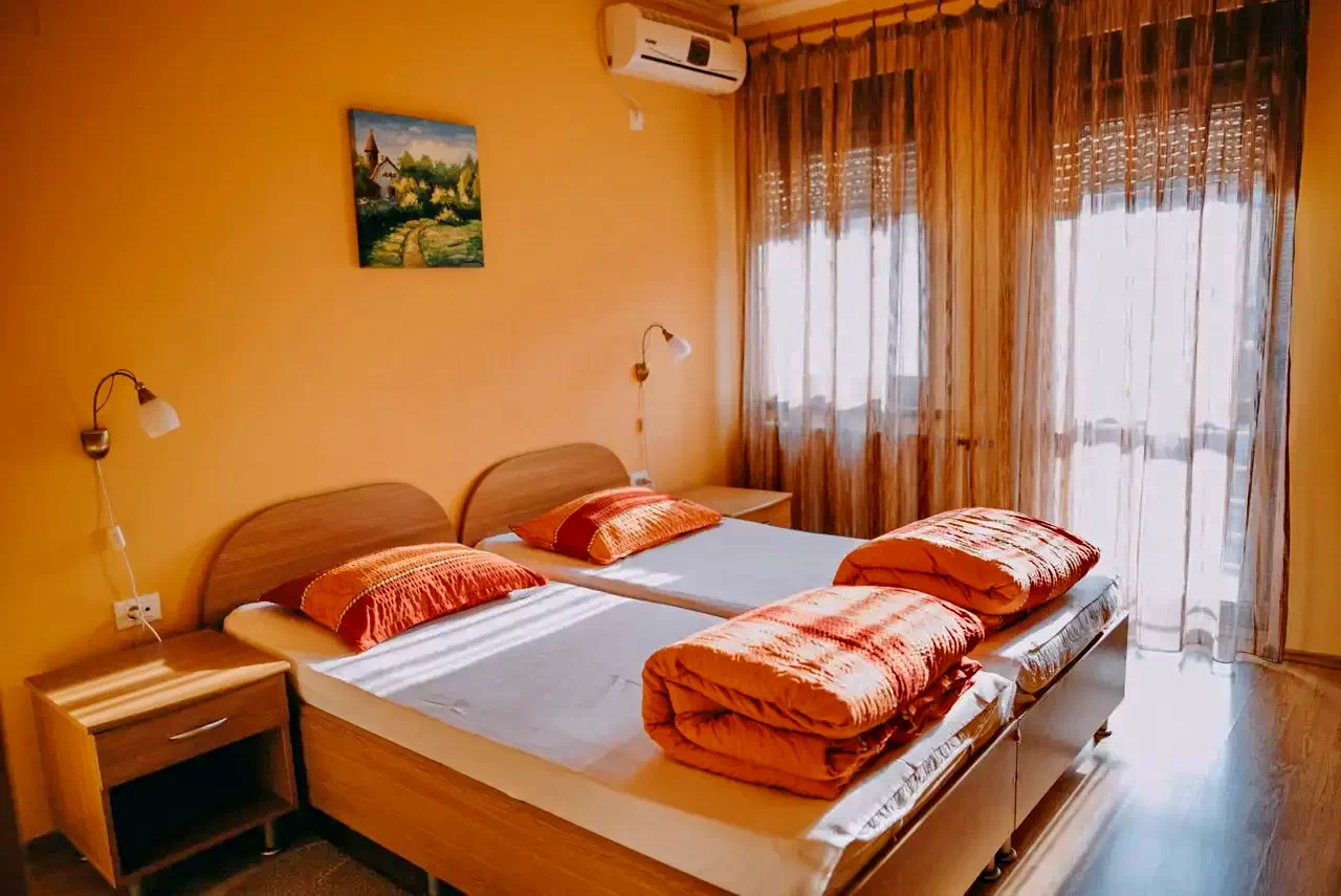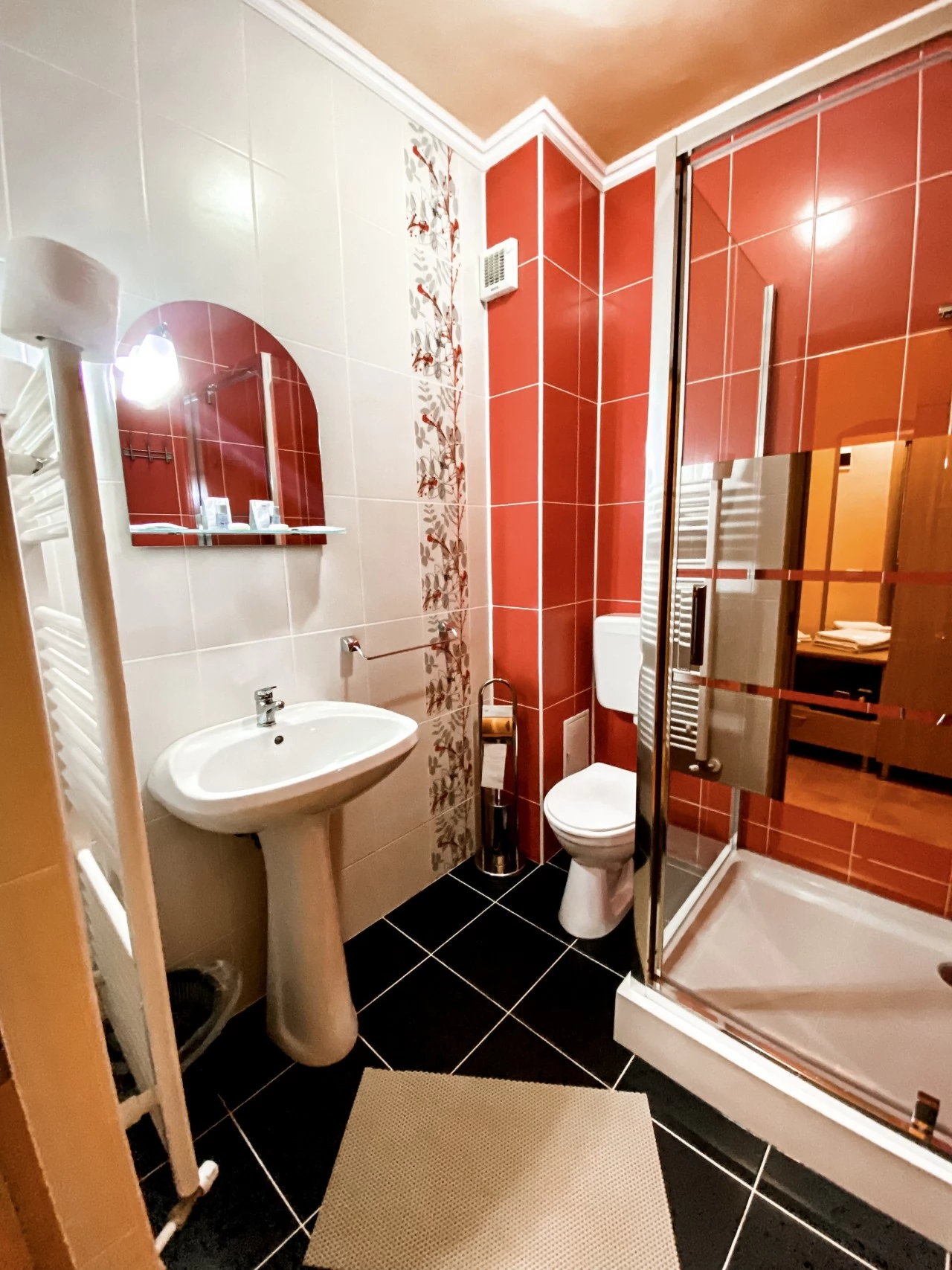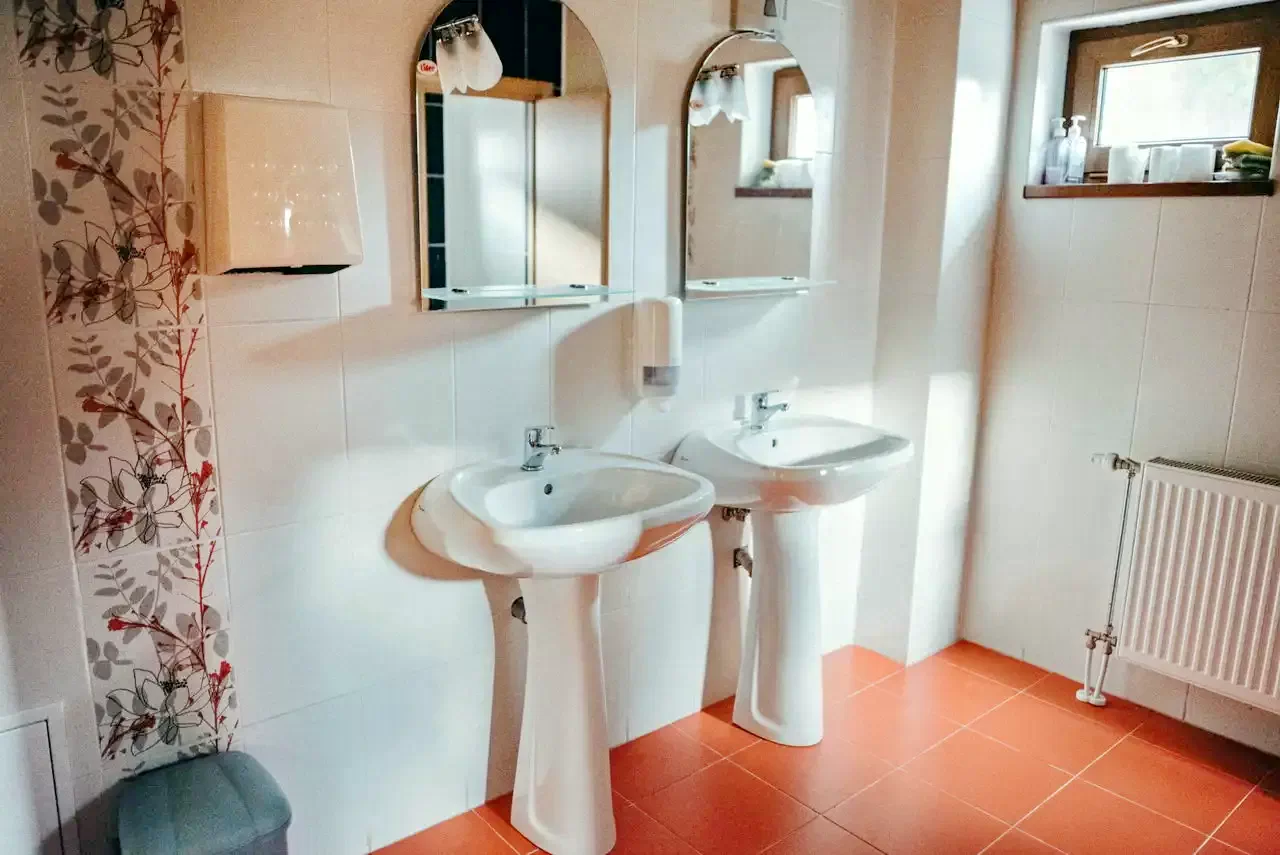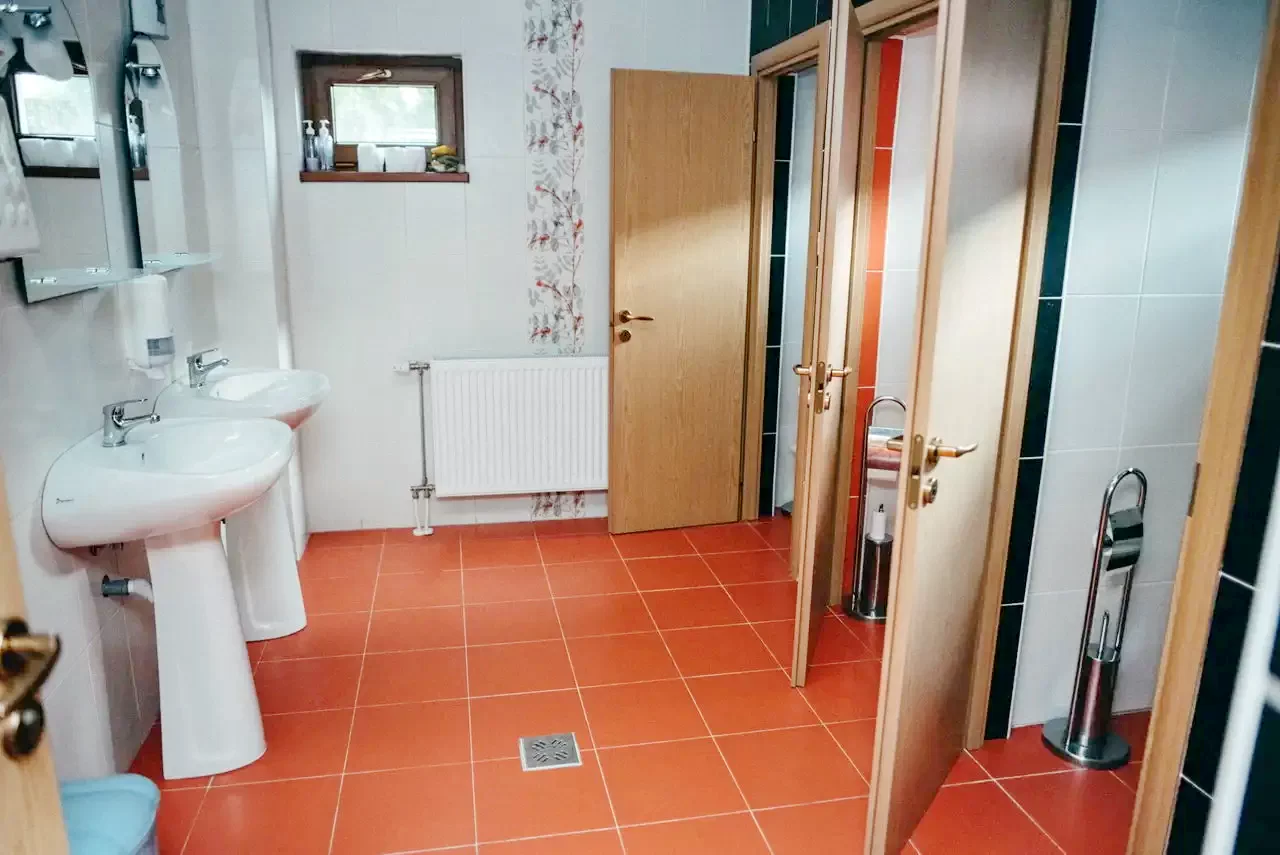 - Fiecare camera este dotata cu baie proprie cu cabina de dus, apa calda si incalzire centrala.