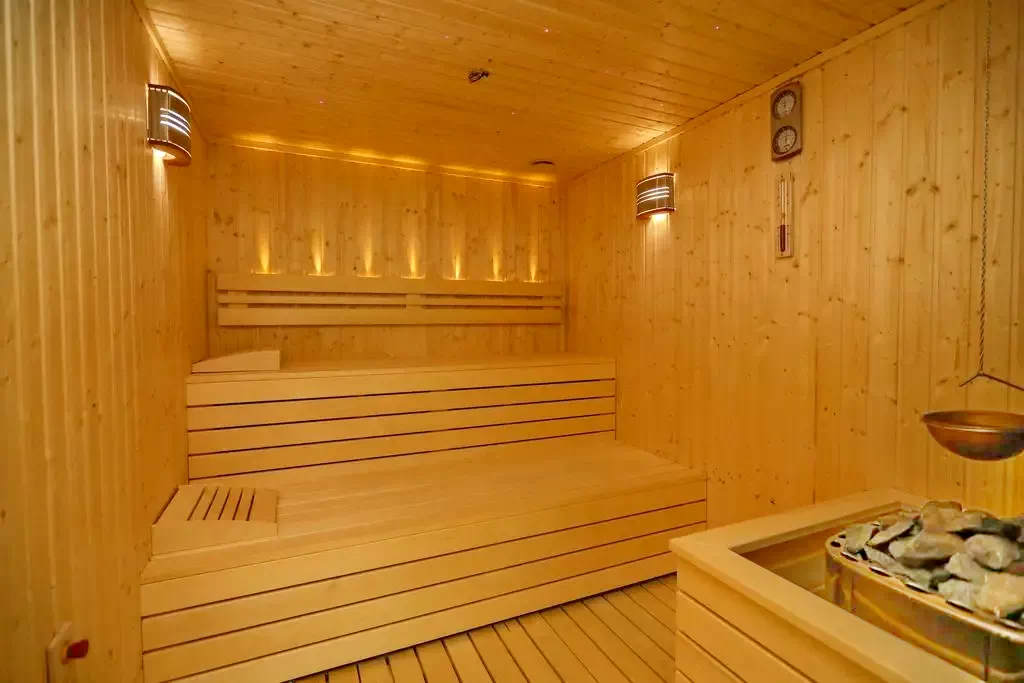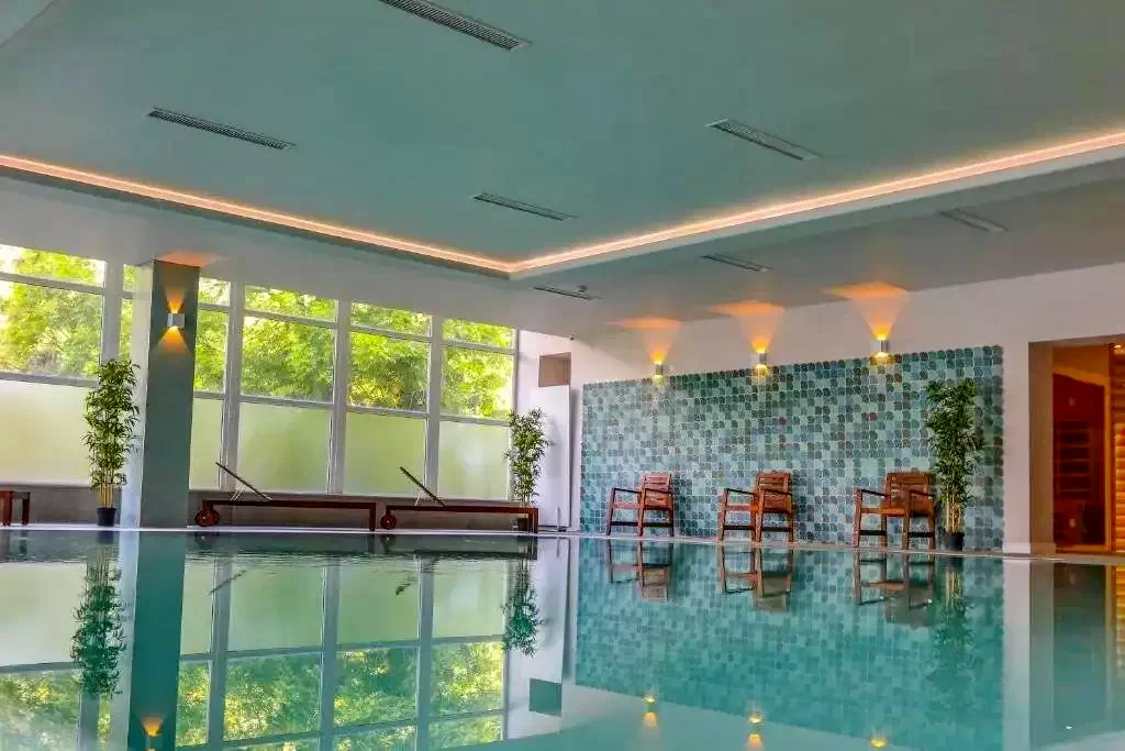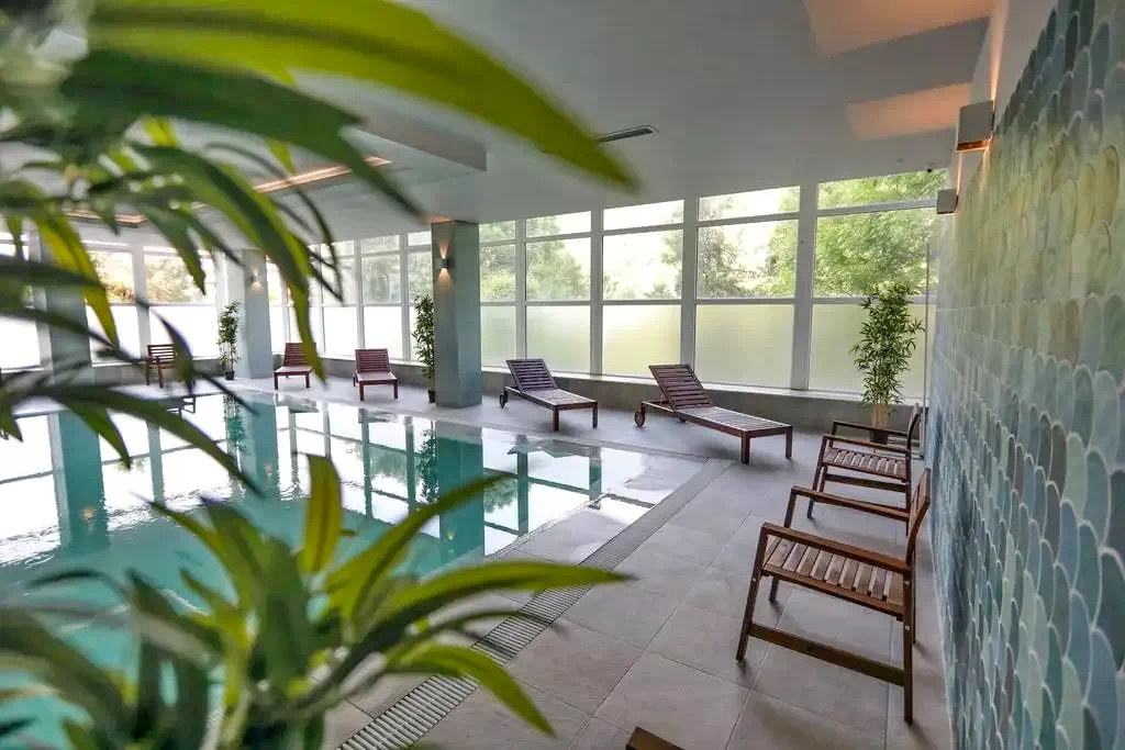 - Piscina interioară are ferestre din podea până la tavan care permit să intre multă lumină naturală. Oaspeţii au la dispoziţie 4 tipuri de saune care oferă beneficiile unei experienţe adevărate de Wellness.