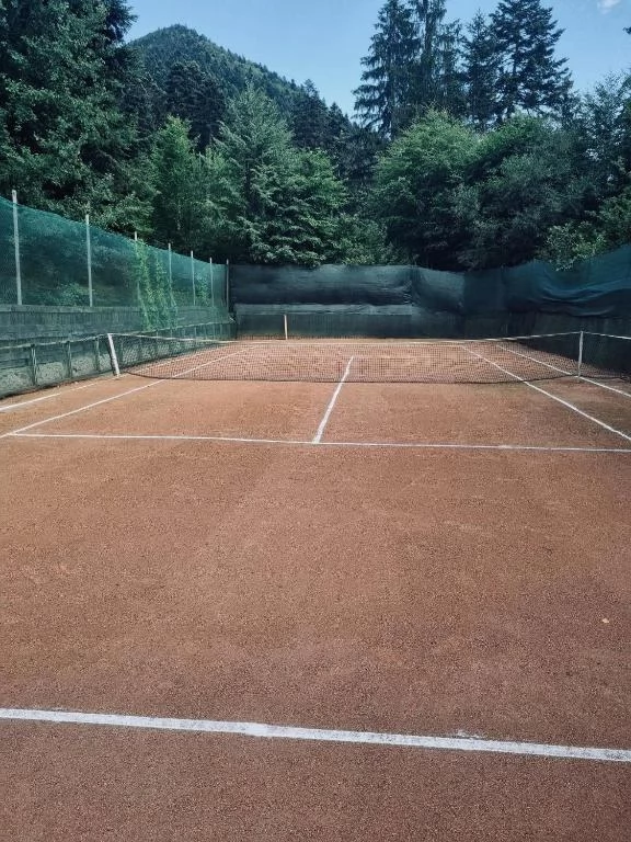 Oferă o curte - gradina, zona verde spațioasă amenajată cu un cuptor, grătar acoperit, mobilier de grădină (masă și scaune pentru 12 persoane), leagăn, șezlonguri, teren de tenis (zgura organica, 500 m2) și parcare spațioasă.