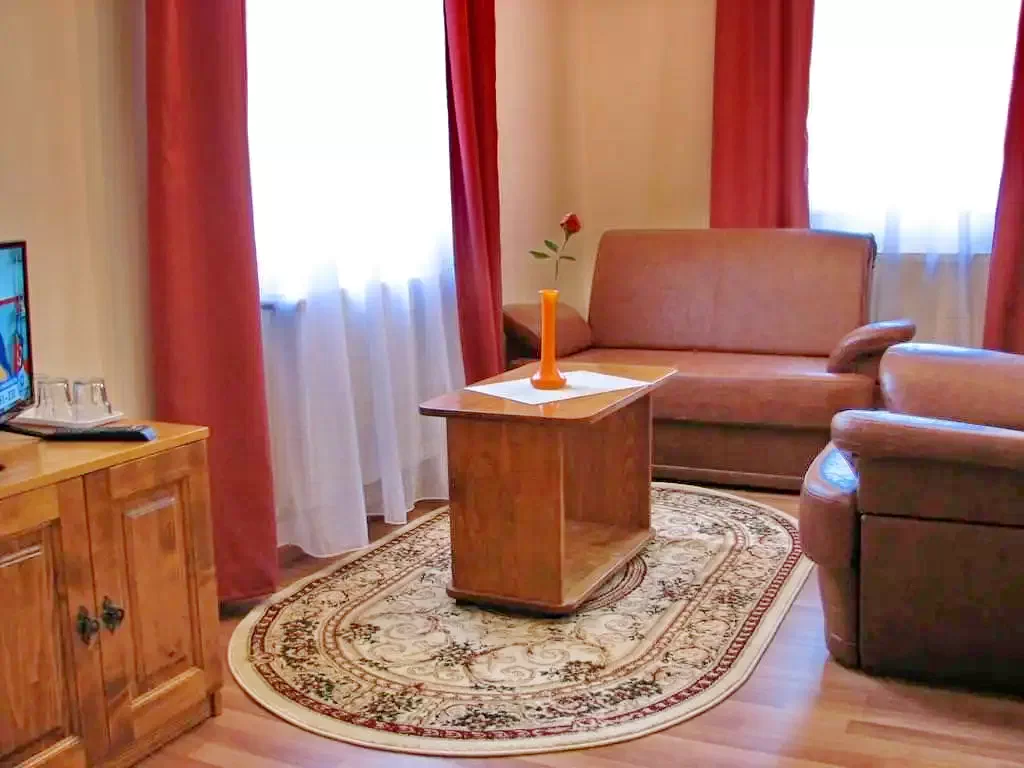 - Apartamentul este compus dintr-un dormitor cu pat matrimonial și un living, unde fotoliul și canapeaua extensibilă oferă loc de dormit pentru încă 2+1 copii sau 2 adulți.