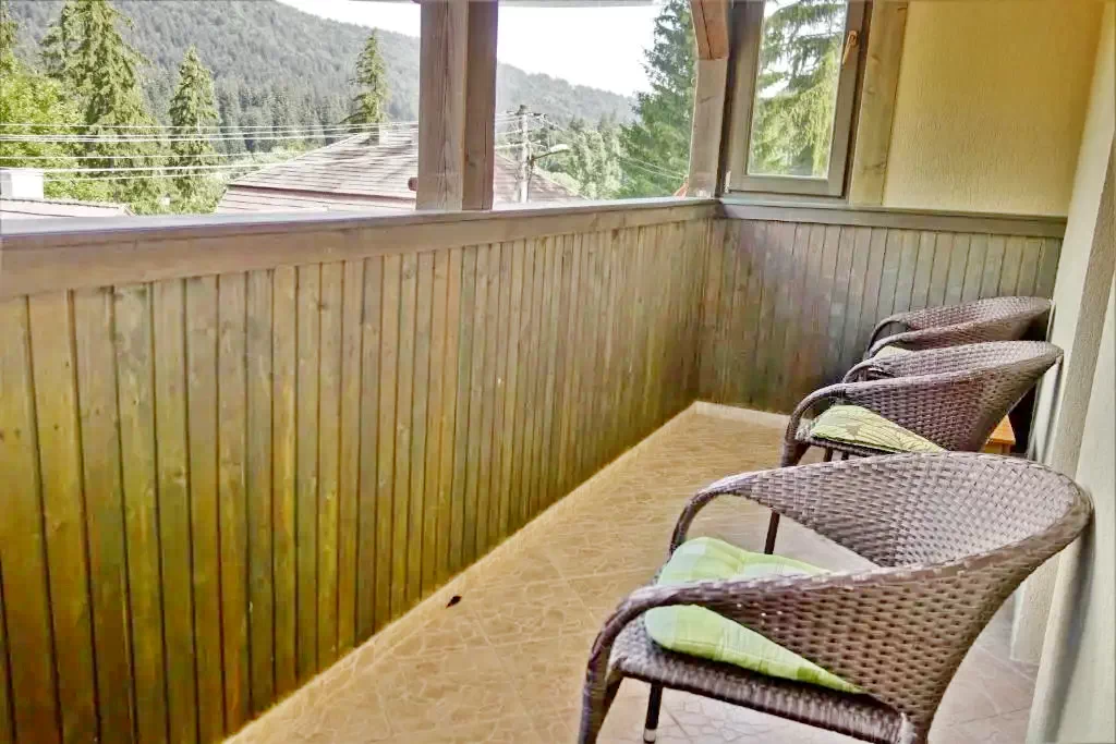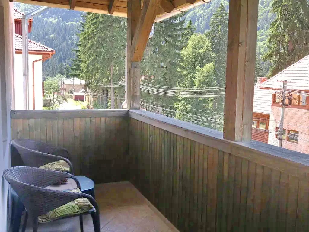 - Spațioasa terasă acoperită de la parter și balconul de la etaj vă oferă o priveliște superbă către munții înconjurători si Stanca Soimilor.