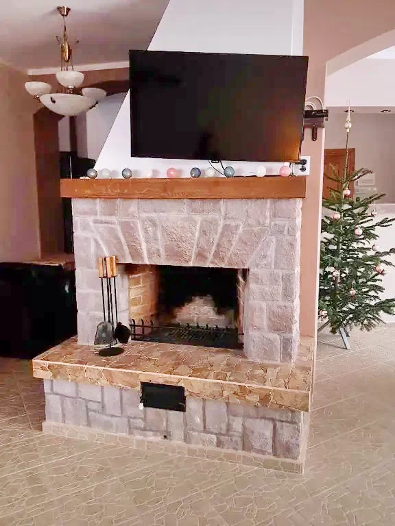 - Livingul comun cu șemineu și tv prin cablu oferă spațiu generos pentru relaxare, servirea mesei și alte activități comune.