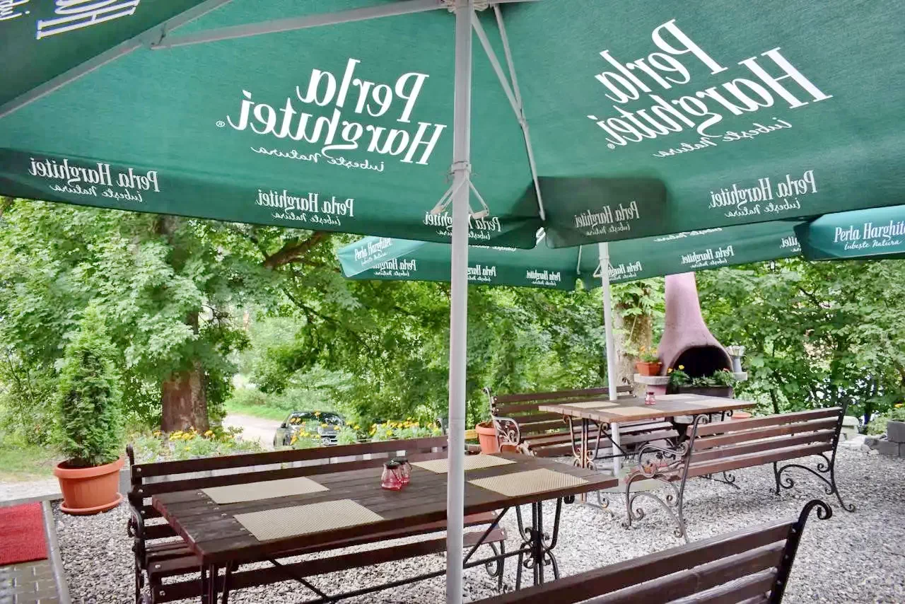 - Pe lângă restaurant, există și o terasă exterioară plăcută, înconjurată de pini, ideală pentru grătar în aer liber sau pentru a savura o băutură răcoritoare.