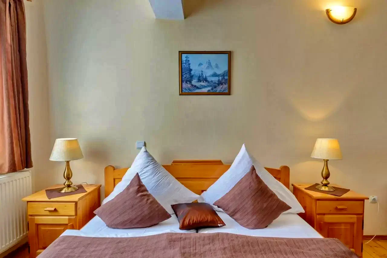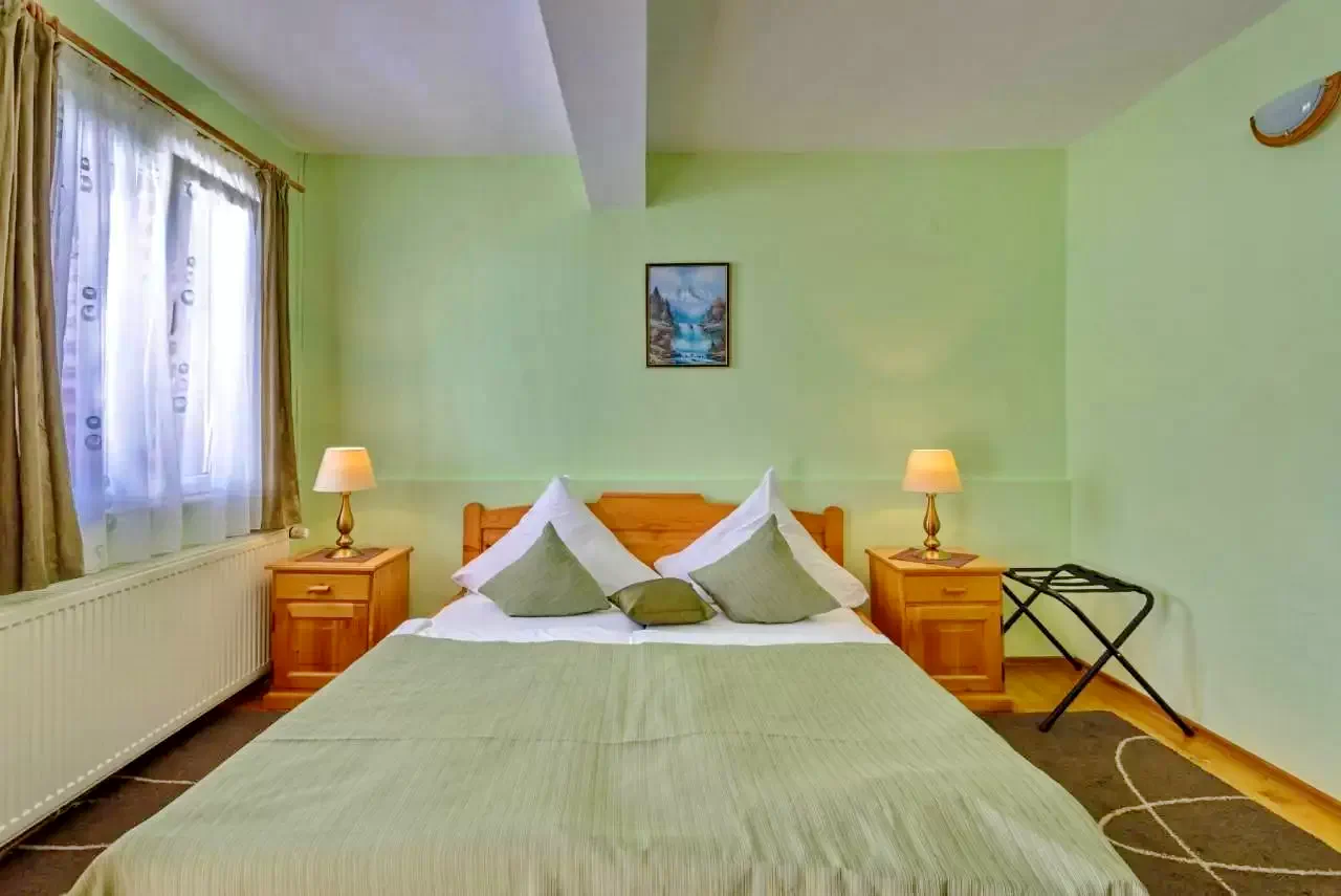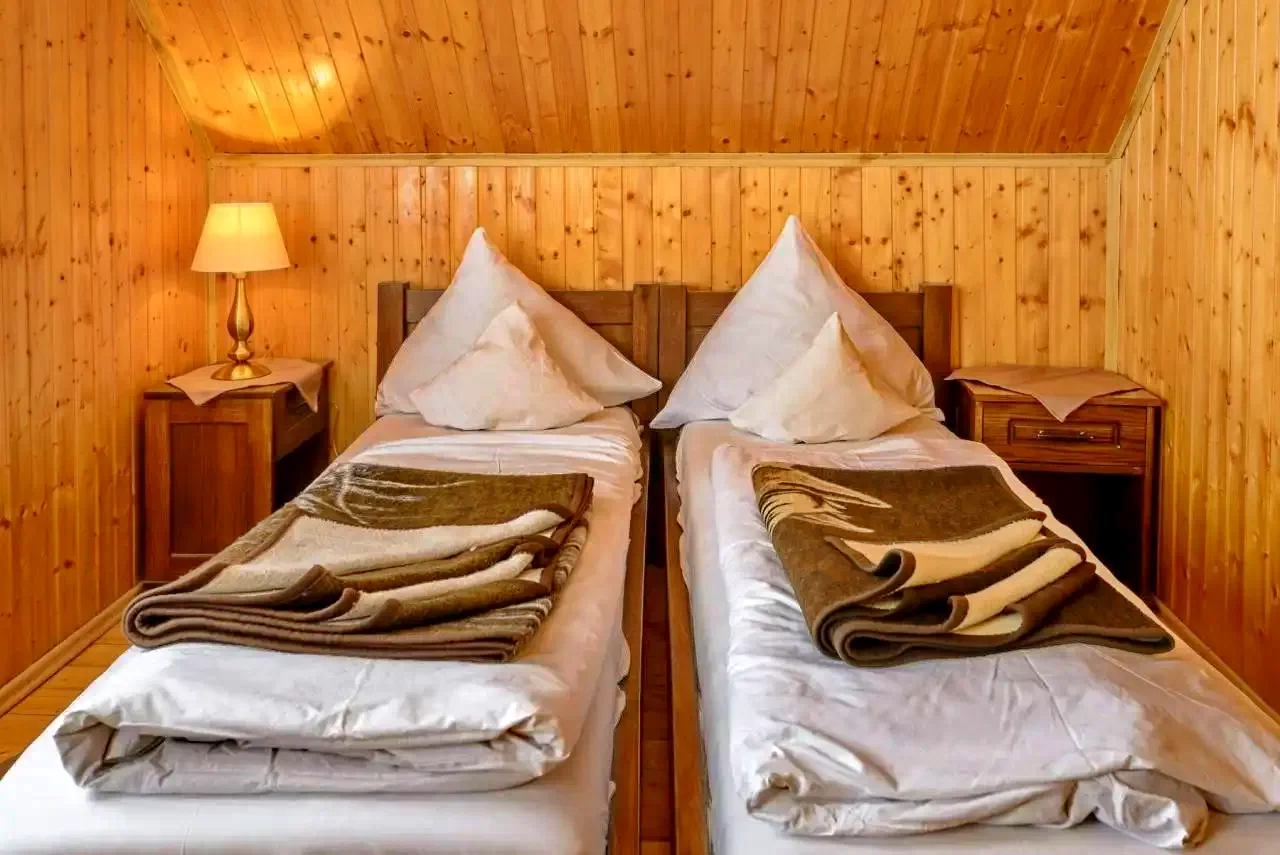 mobilier din lemn natural in stil rustic subtil modernizat, lenjerie de pat de calitate superioara, WC mobilat, dus, WC, apa calda functionala (permanenta), uscator de par.