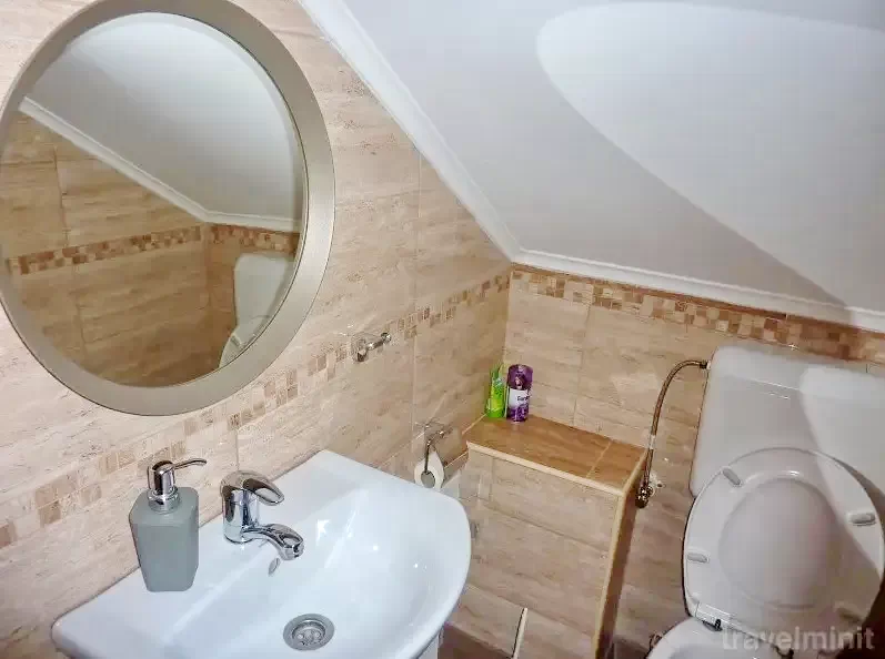 - Etaj 2: 2 dormitoare (câte un pat dublu și un pat simplu), toaletă separată (WC, chiuvetă)