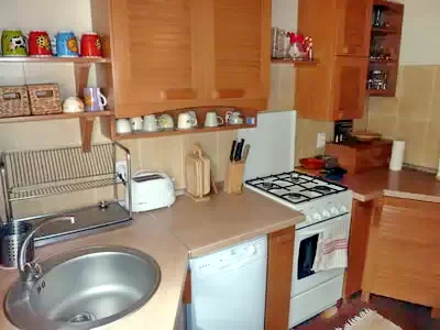 - Bucătărie complet echipată (plită pe gaz, frigider, mașină de spălat vase, cuptor cu microunde, cafetieră, prăjitor de pâine, oală sub presiune)