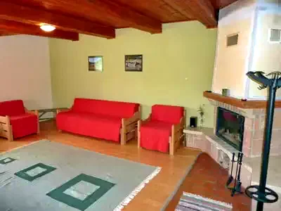 - La parter se află un living-sufragerie primitor, unde căldura șemineului și televizorul cu satelit contribuie la o atmosferă plăcută de seară.