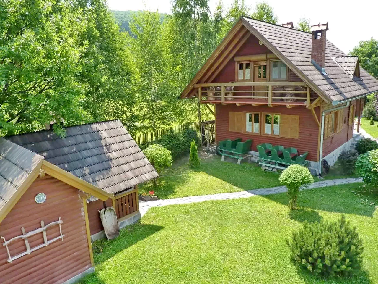 - Clădirea principală include un living spațios, sufragerie și bucătărie complet utilată, iar la etaj două dormitoare confortabile și o toaletă.