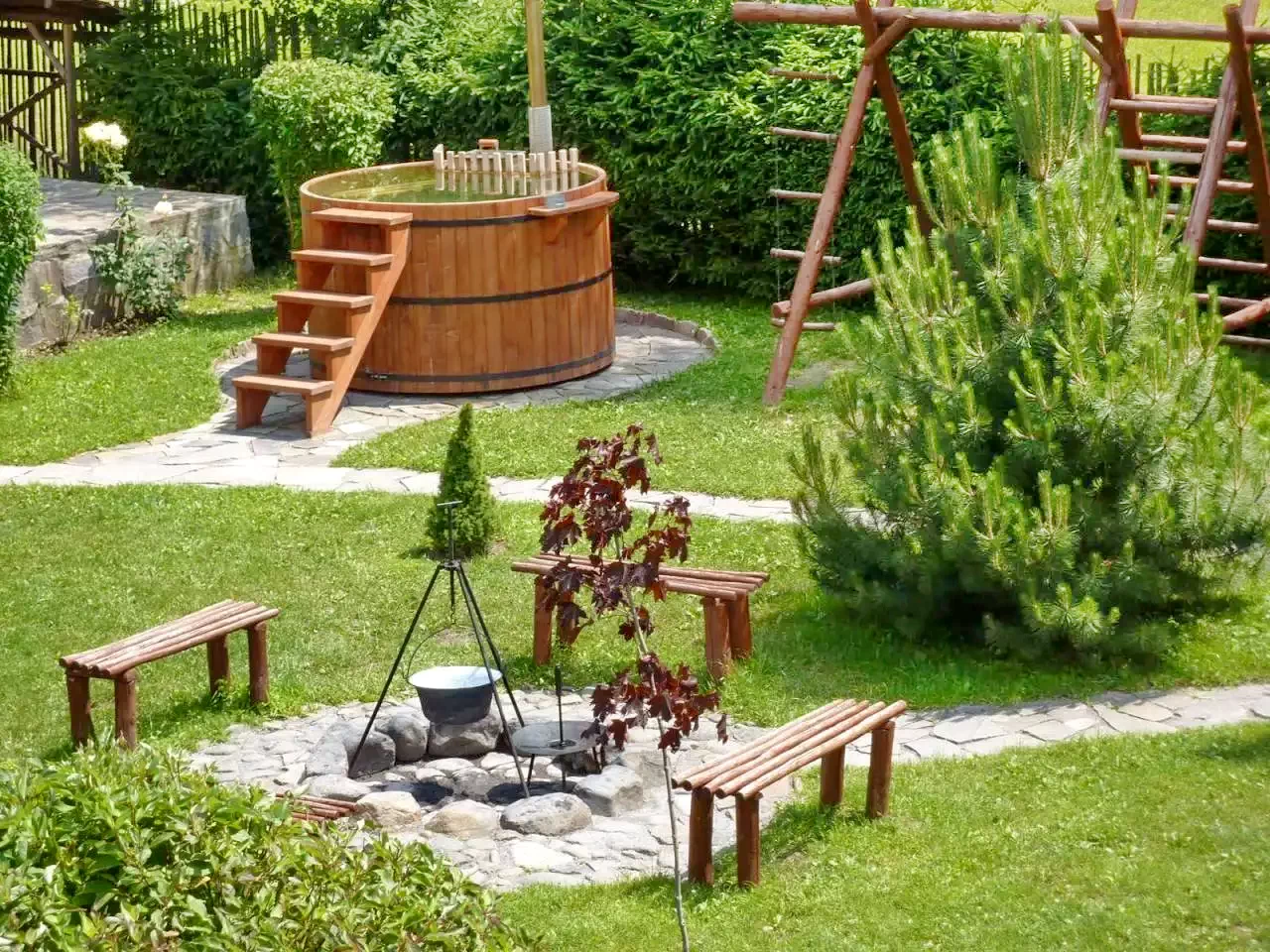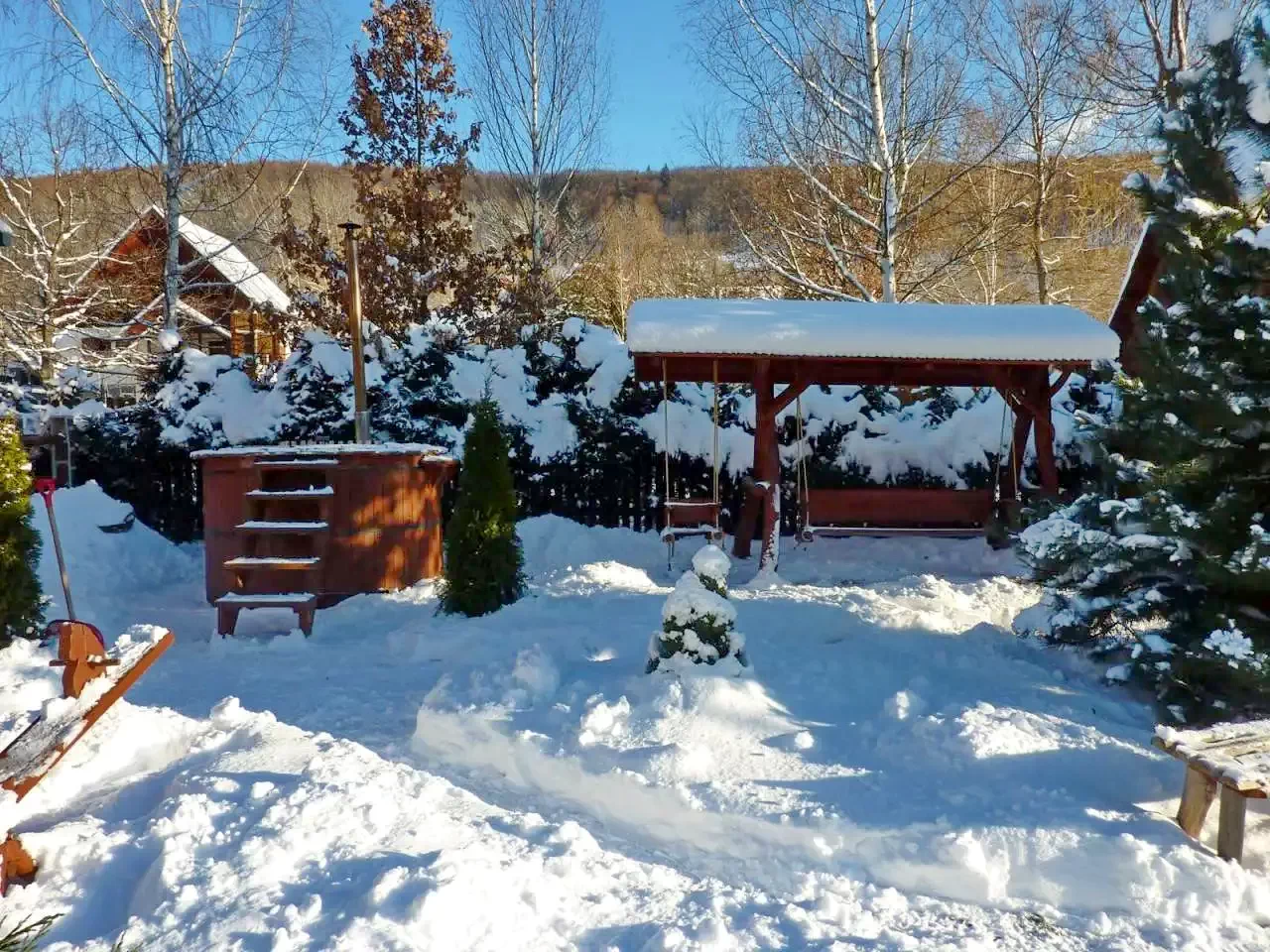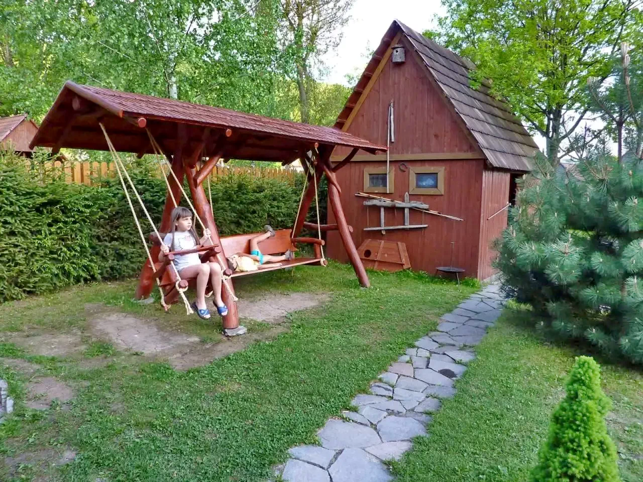- Șezlonguri, duș exterior, leagăn, tobogan, groapă cu nisip.