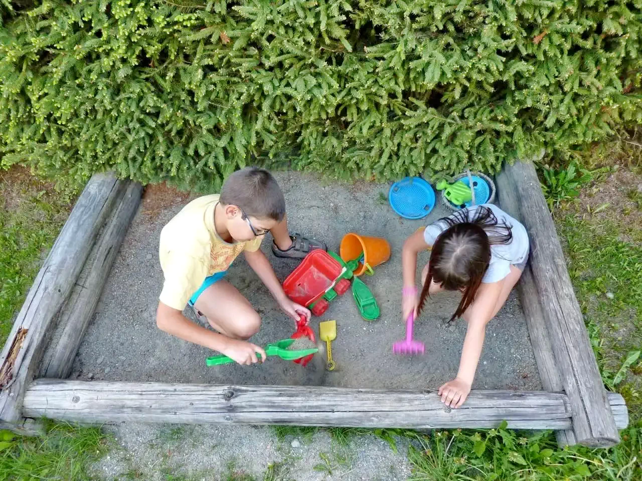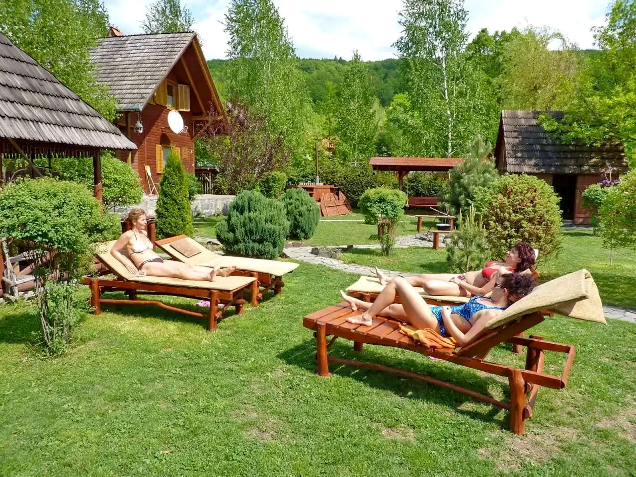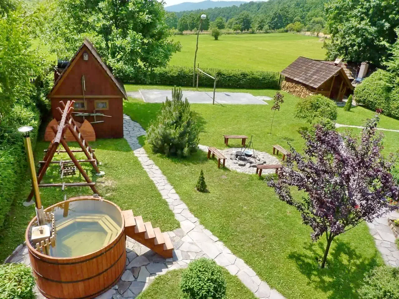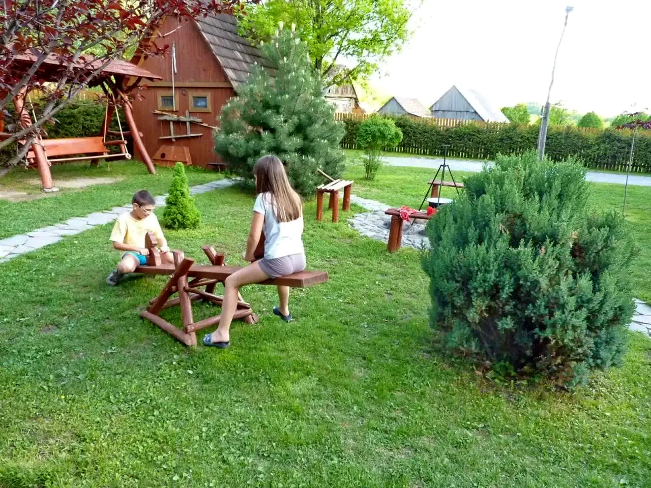 - Șezlonguri, duș exterior, leagăn, tobogan, groapă cu nisip.