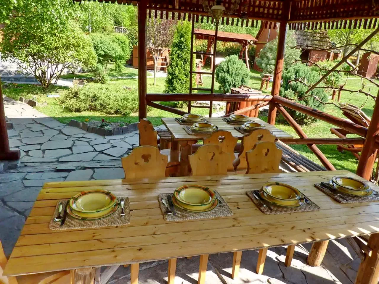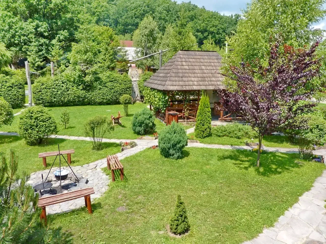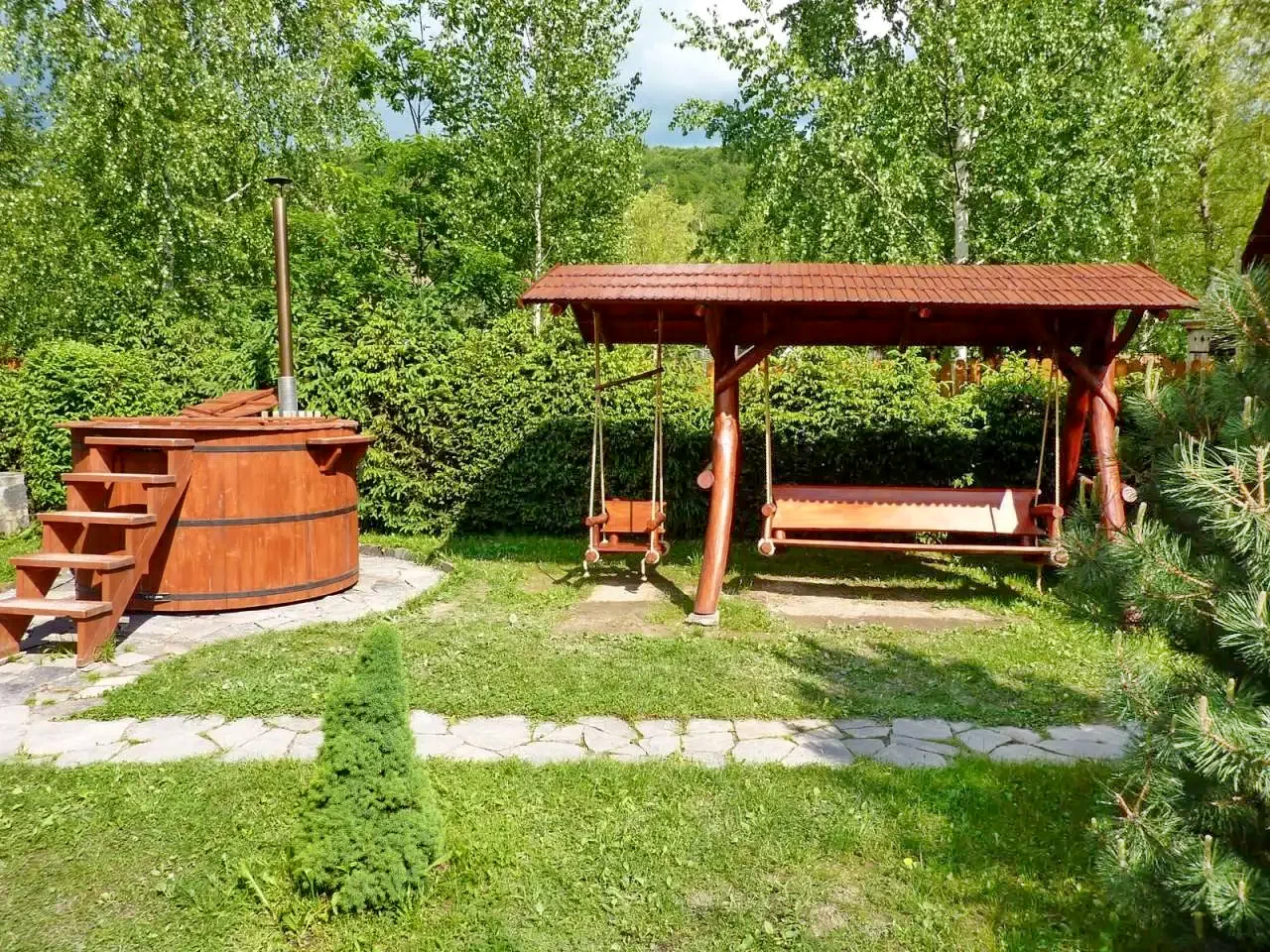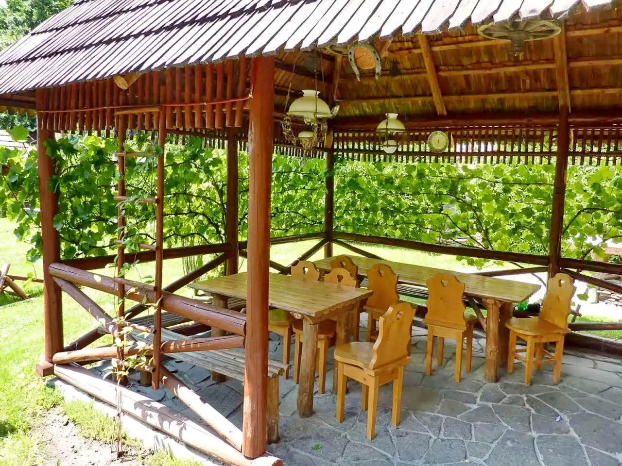 - Foișor acoperit, pavilion de grădină și terasă.