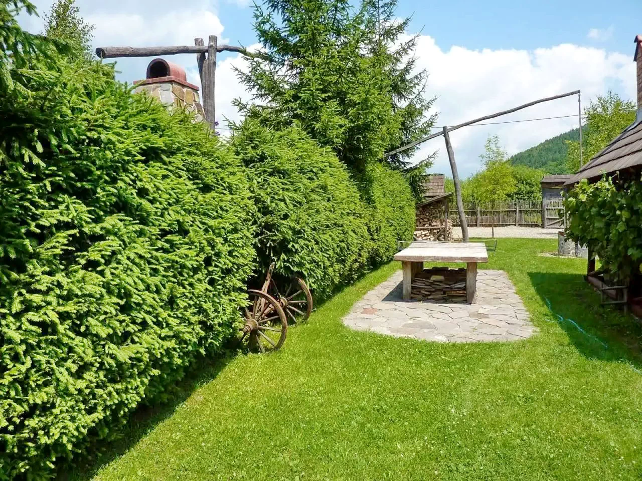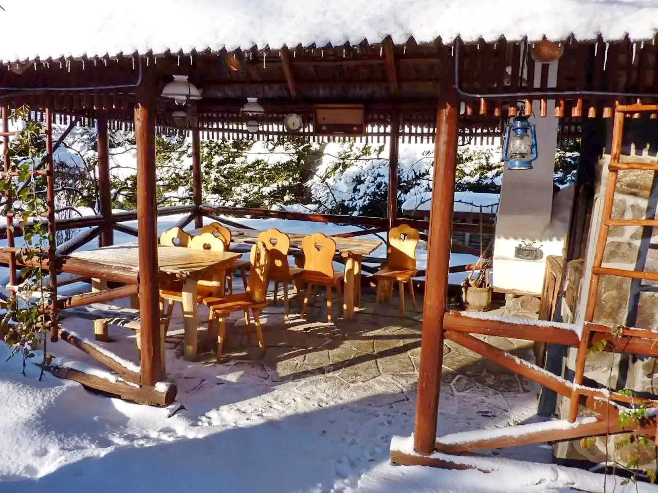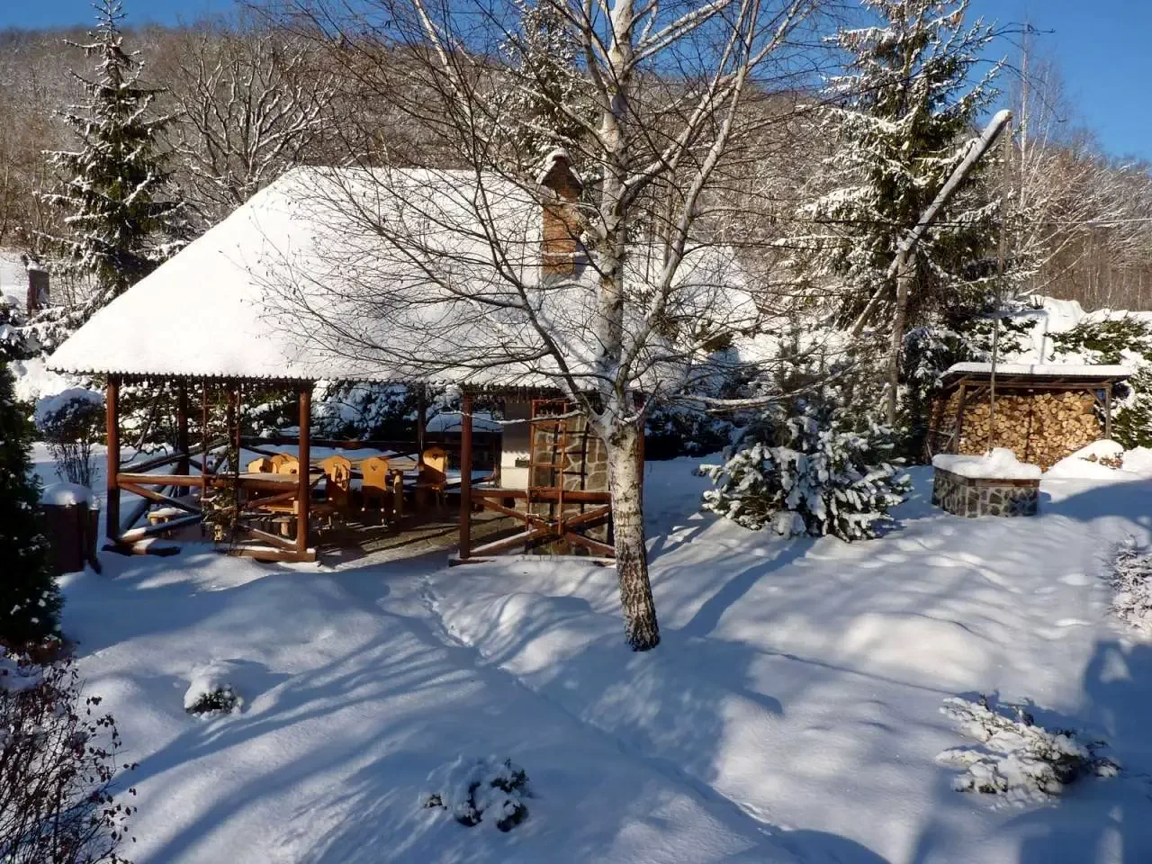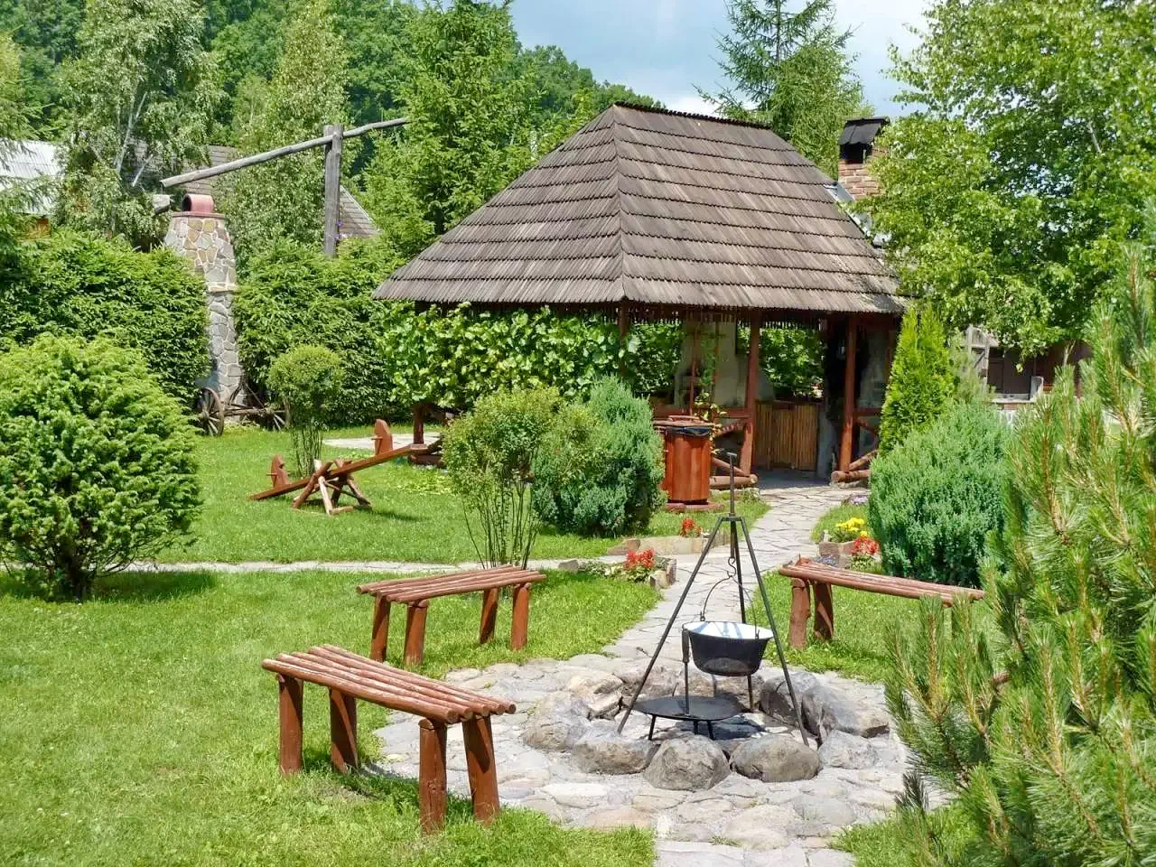 - Foișor acoperit, pavilion de grădină și terasă.