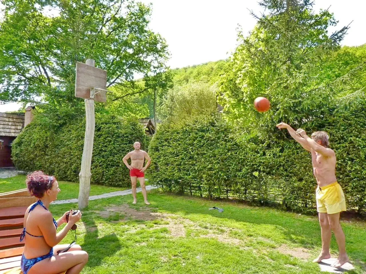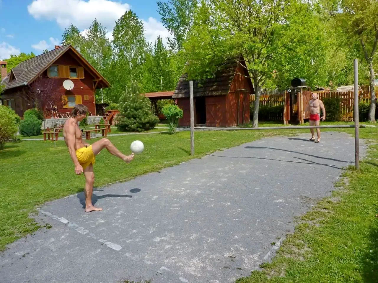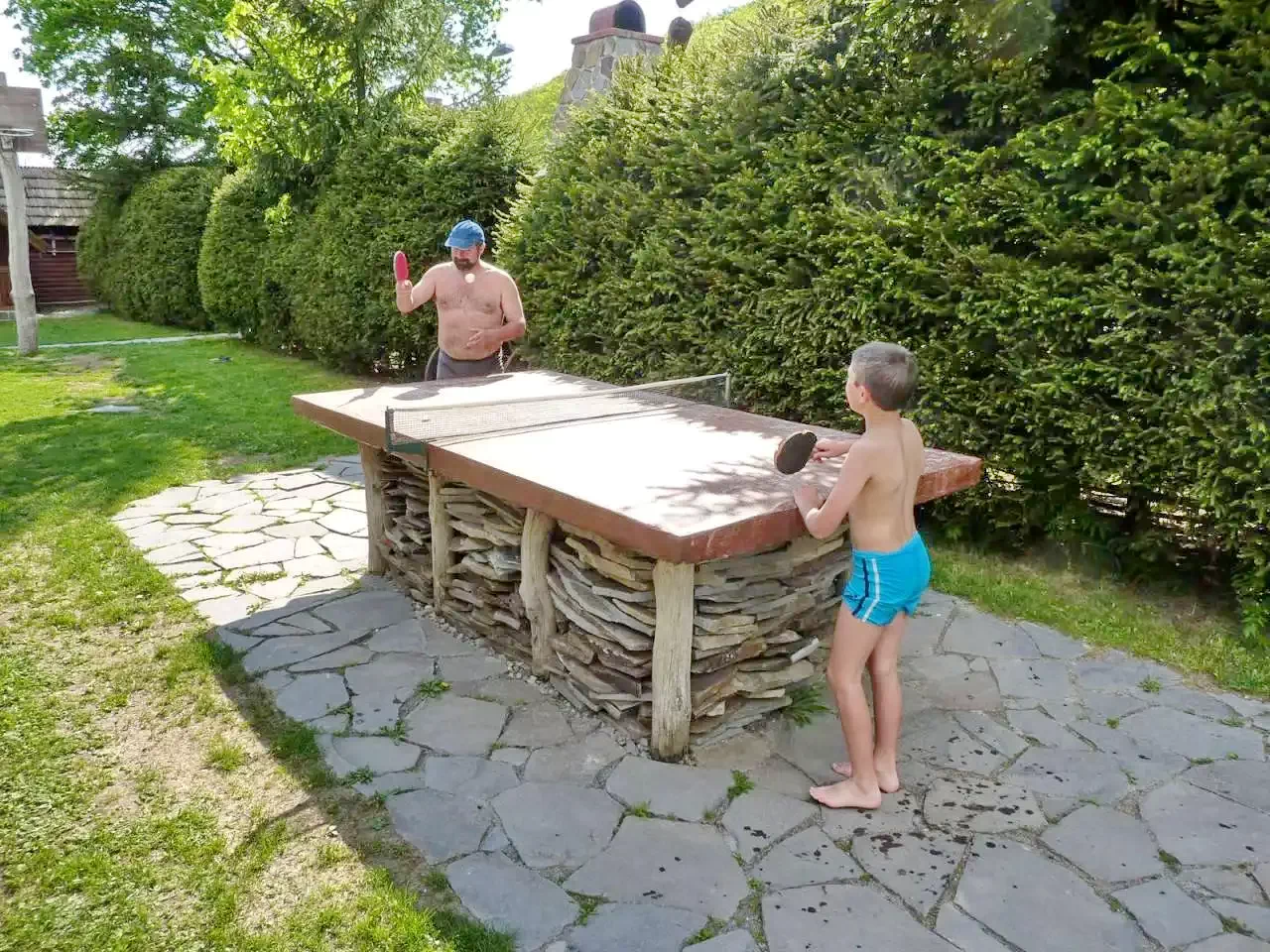 - Curtea generoasă oferă numeroase opțiuni de divertisment: masă de ping-pong, teren de fotbal-tenis și volei, coș de baschet, leagăn, tobogan și groapă cu nisip, potrivite pentru toate vârstele.