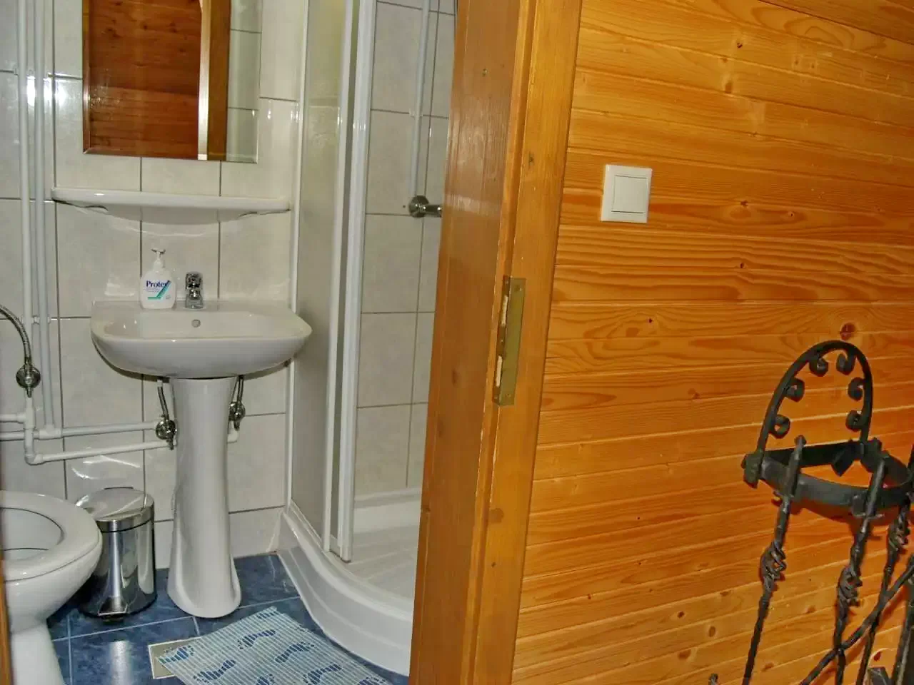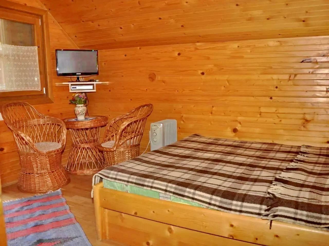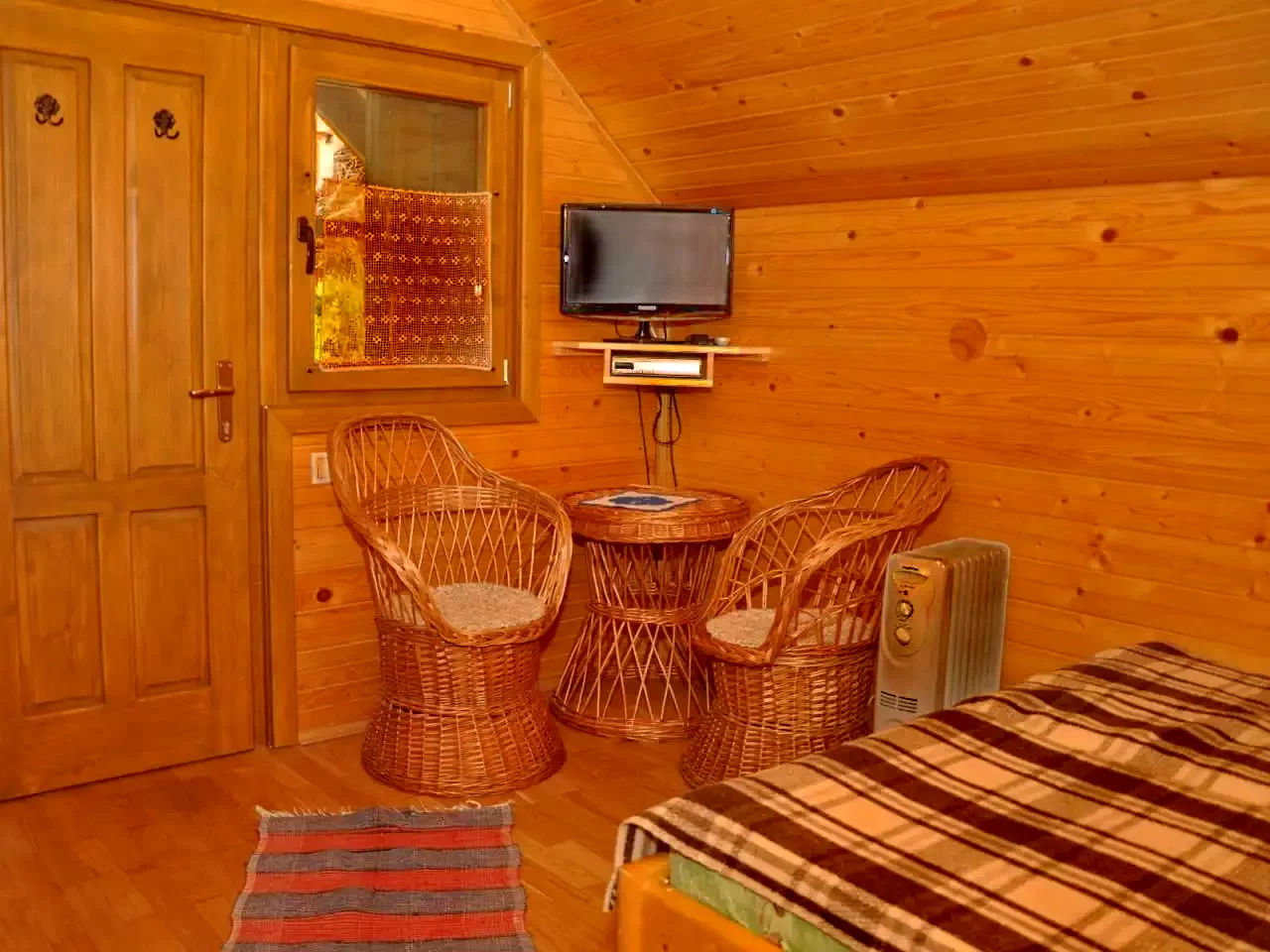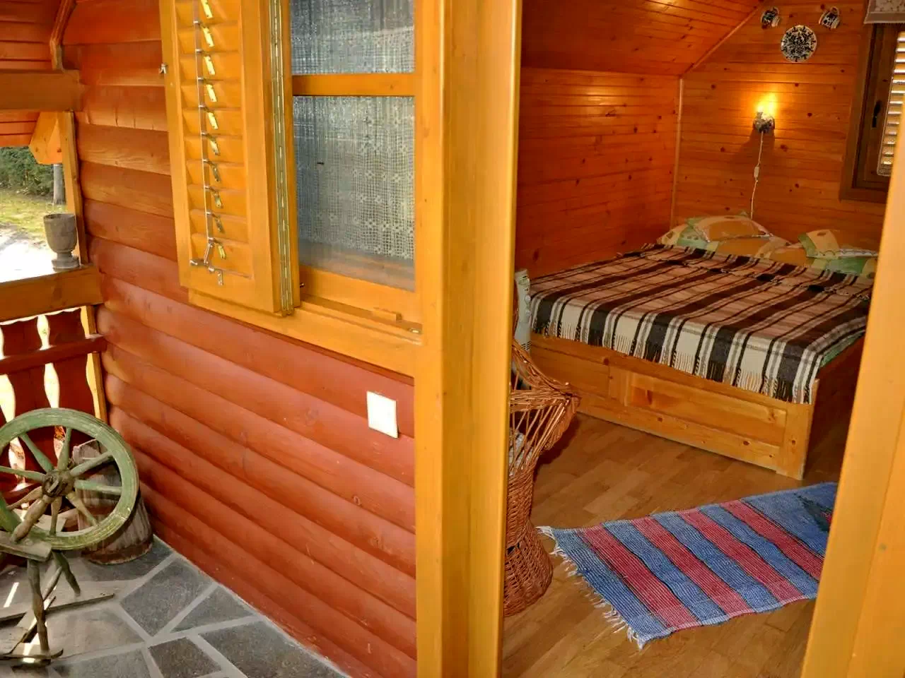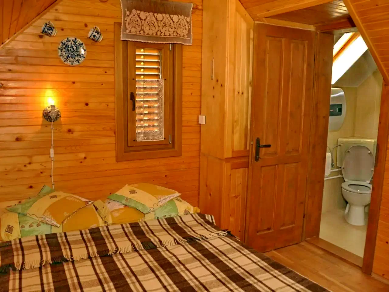 - Căsuțe (2 x 2 locuri): Două căsuțe izolate termic, fiecare cu pat dublu, baie proprie (WC, duș, chiuvetă, boiler electric) și încălzire reglabilă cu radiator cu ulei.