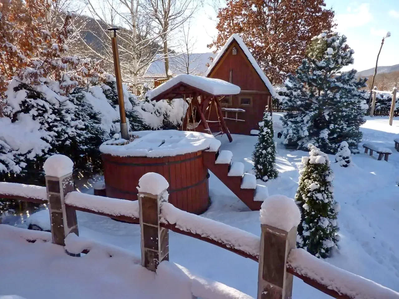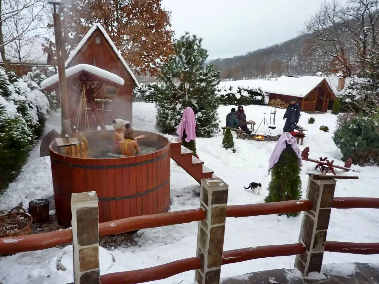 - Jacuzzi secuiesc (ciubăr cu apă caldă): Ciubărul de 2 metri diametru, cu o capacitate de 3500 litri, încălzit, oferă relaxare pentru 6-8 persoane, indiferent de anotimp. Preț: 70 € pentru 2 zile, 20 €/zi pentru zilele suplimentare (minimum 2 zile).