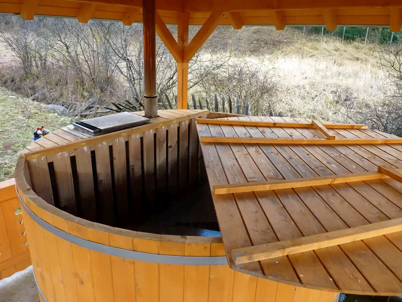 Wellness: Ciubăr secuiesc încălzit (2 m diametru, 3500 litri, 6-8 persoane, anunțat cu 2 zile înainte).