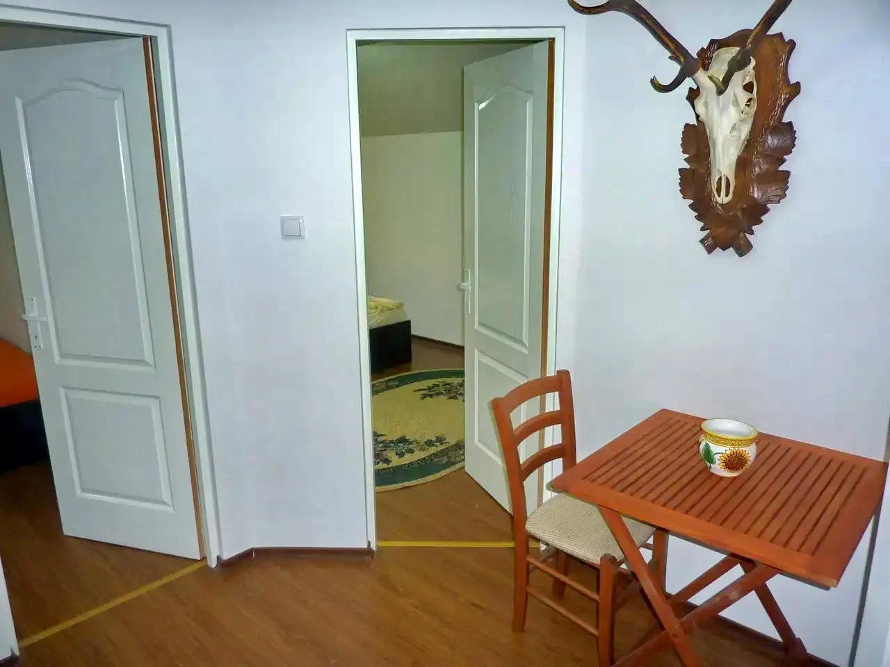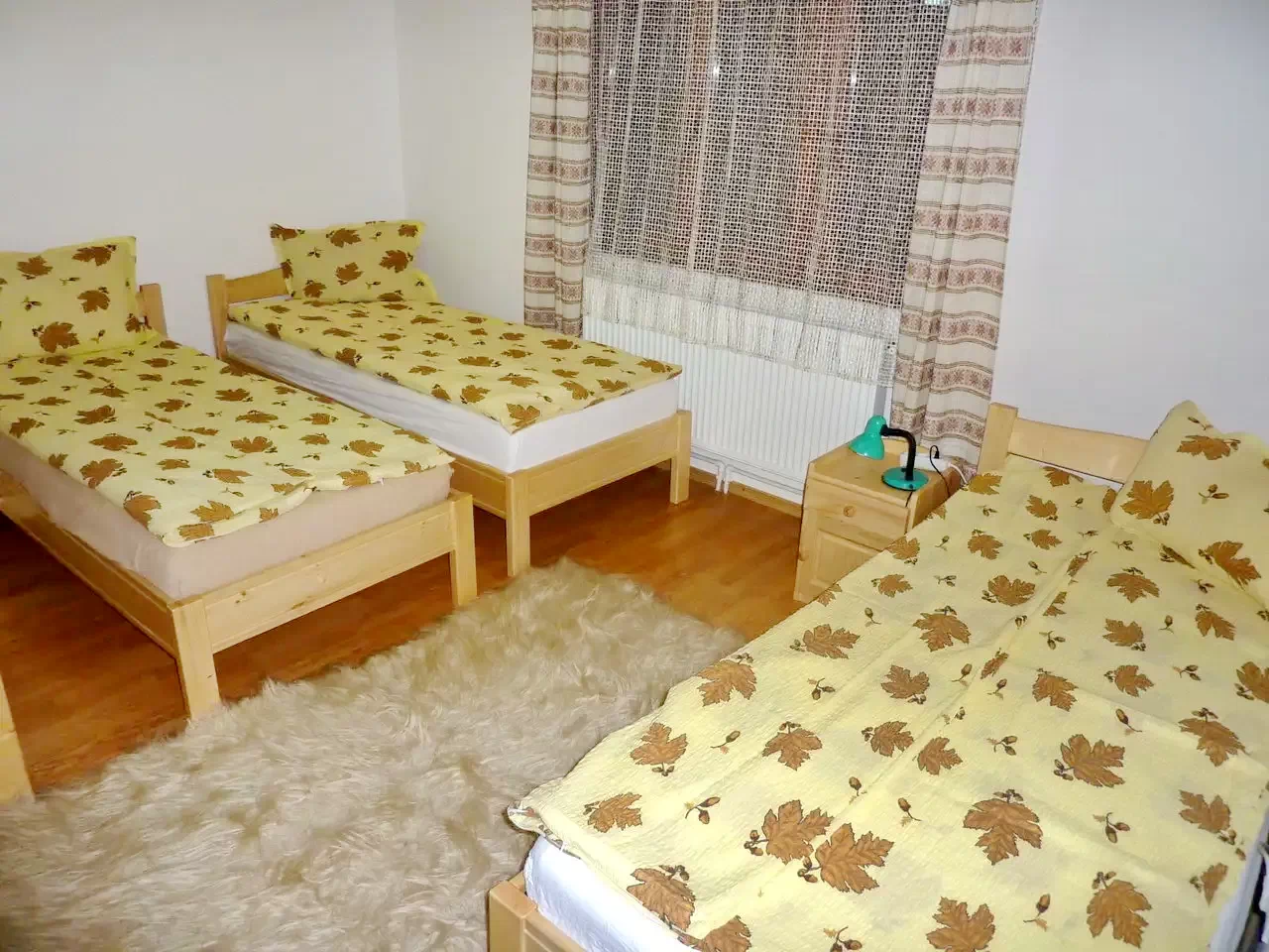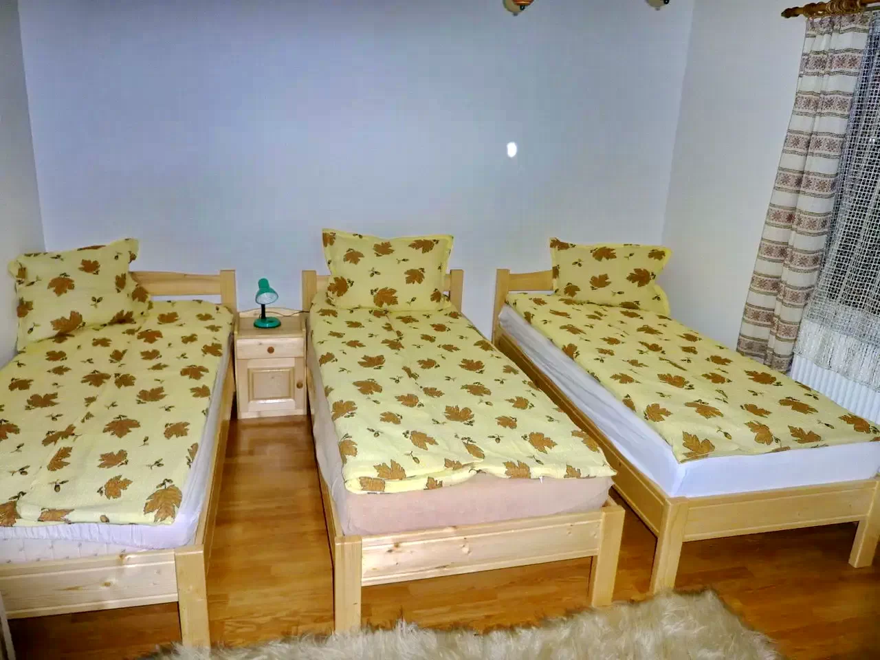 Camere: Două camere cu pat dublu, una cu pat dublu și pat single.