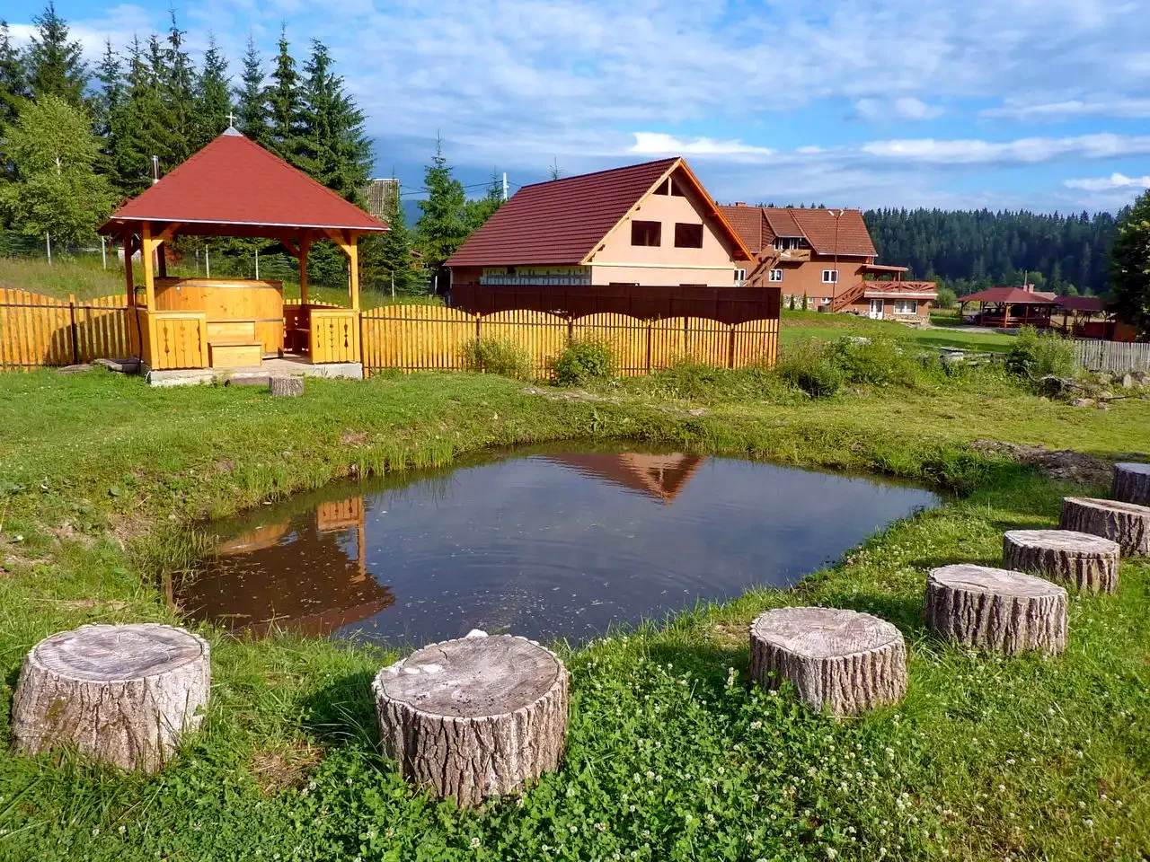 - Curtea de 2000 m² dispune de un ciubăr secuiesc încălzit (2 m diametru, 3500 litri, pentru 6-8 persoane), terasă și leagăn, pentru relaxare completă.