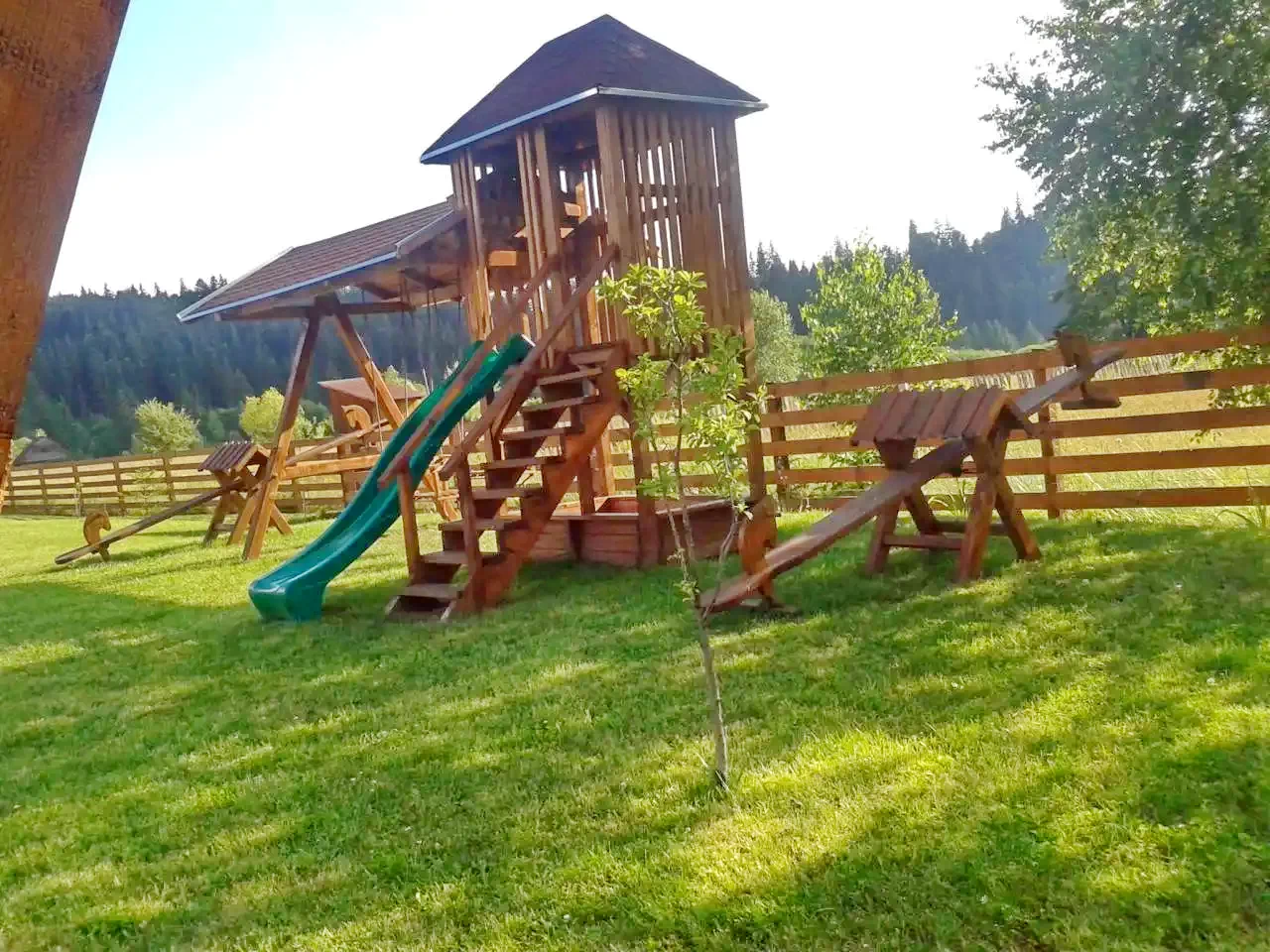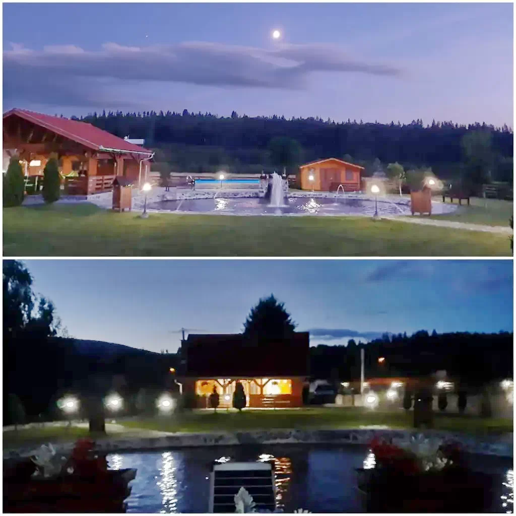 - Curtea de 10000 m² include foișor acoperit, pavilion de grădină, terasă, șezlonguri, leagăn, balansoar, tobogan, nisipoar și duș exterior, ideale pentru familii și grupuri.