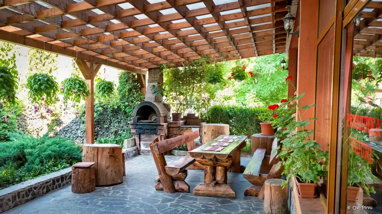 - In fata si in spatele pensiunii se afla cate o terasa acoperita cu semineu (gratar, ceaun),dintre care cel din fata cladirii are si un cuptor.
