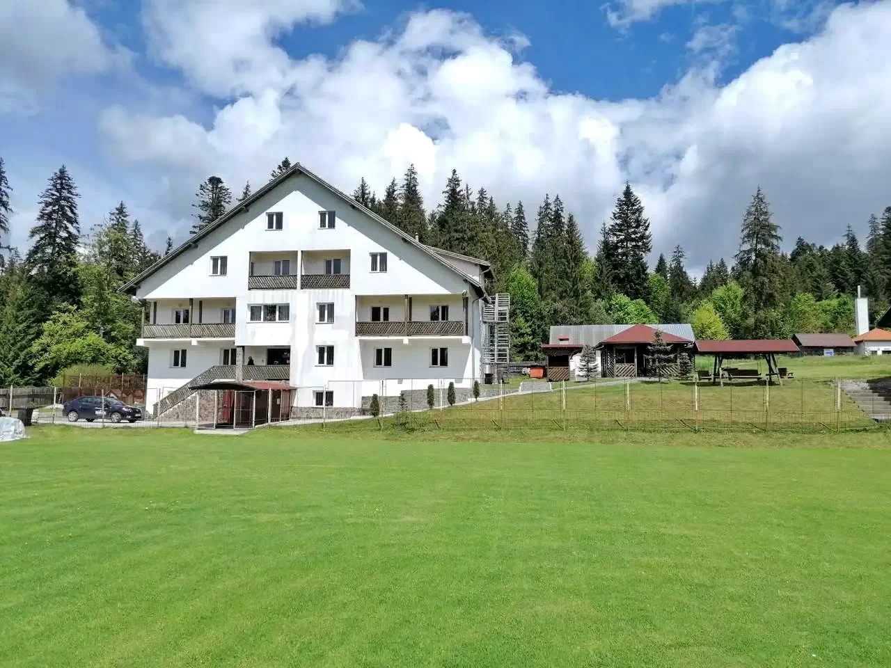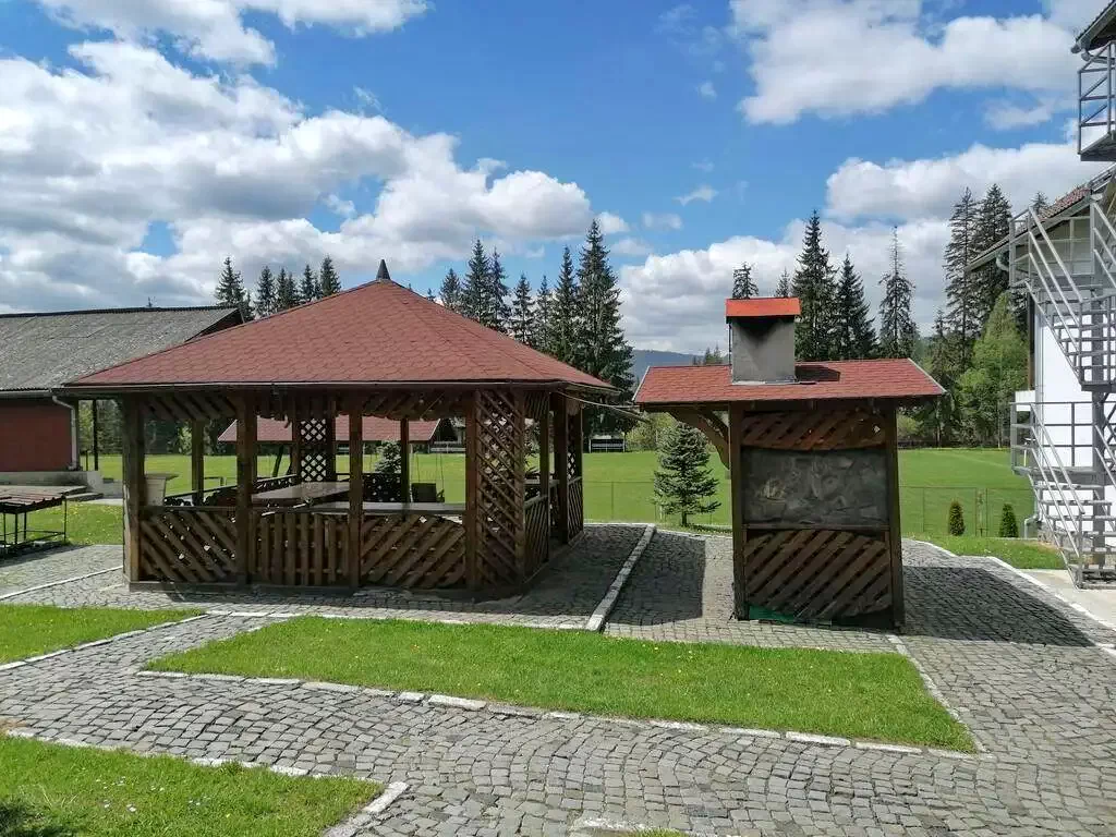 Cazare Borsec Pensiune Vila*** | La marginea pădurii, în poiană, bucătărie, sufragerie, WIFI, sală evenimente, centru fitness, saună, curte, teren fotbal, logie, grătar, parcare | 700m pârtie schi Borszék, 2,7km Peștera Ursilor, 500m Centru SPA