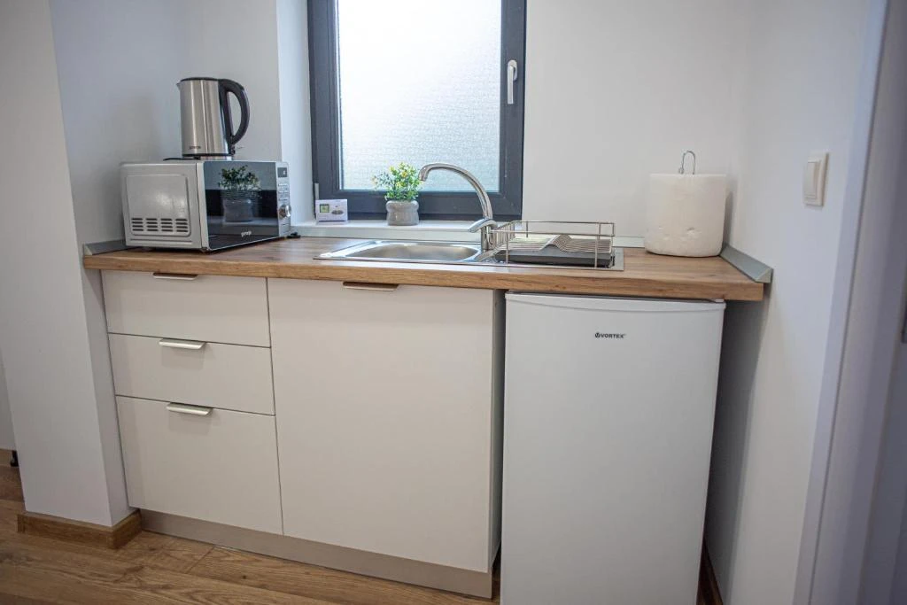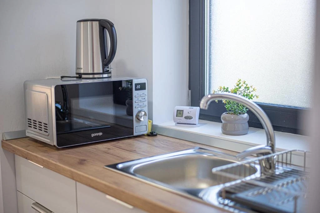 Apartamentele dispun de chicineta complet utilata (cuptor cu microunde, fierbator, prajitor de paine, vase), permitand oaspetilor sa isi pregateasca mesele in mod independent.