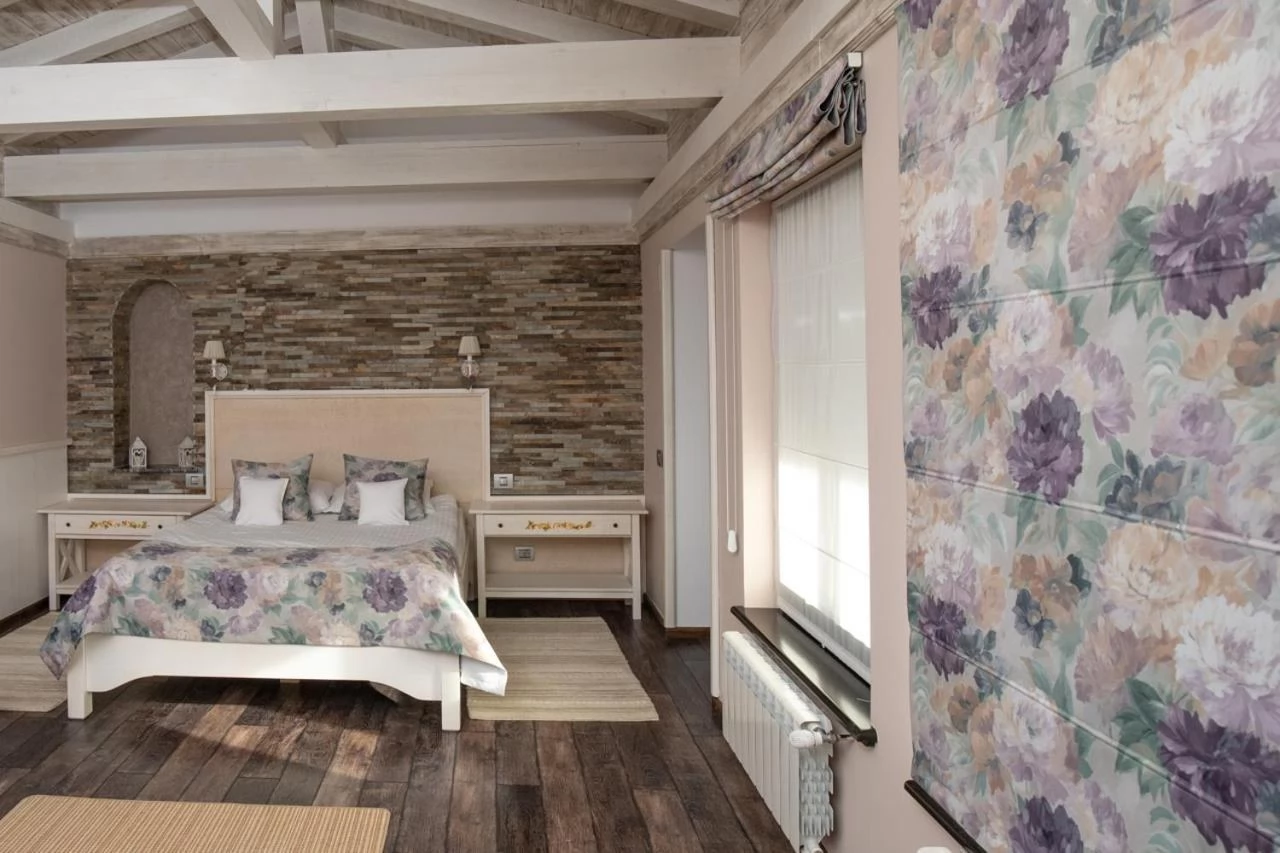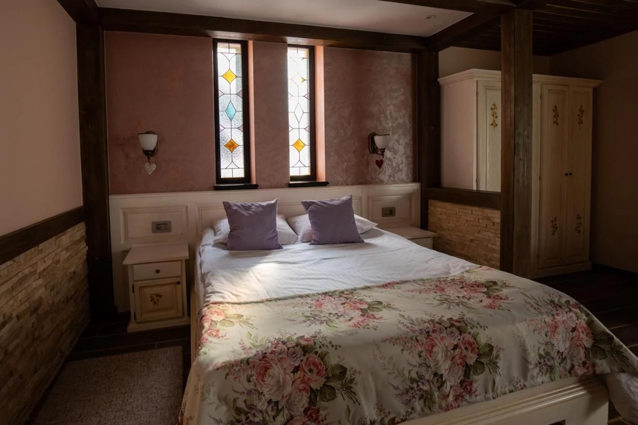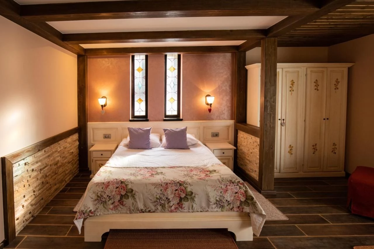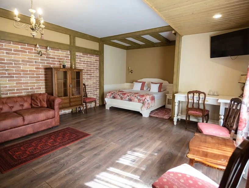 - Datorită stilului său arhitectural unic, amenajarea camerelor pensiunii este personalizată și foarte variabilă. Fiecare cameră are baie proprie cu cabină de duș, apartamentele au cadă cu hidromasaj, iar amândouă categorii dispun de uscător de păr, TV prin cablu, minibar, balcon, telefon intern și internațional, internet gratuit prin cablu și o tavă de bun venit (fierbător, apă plată, ceai și cafea instant).