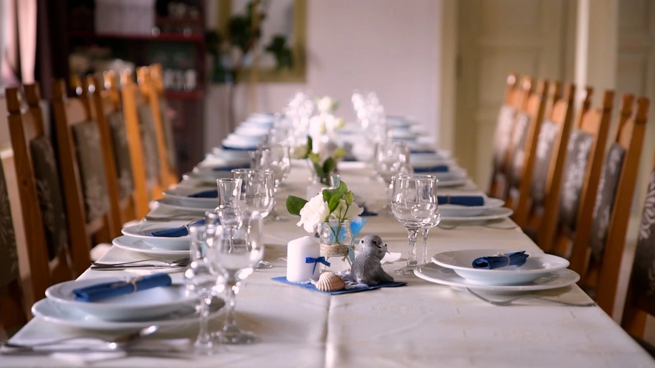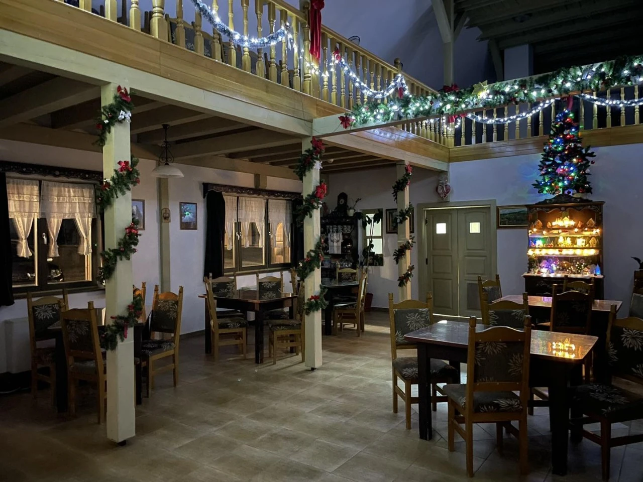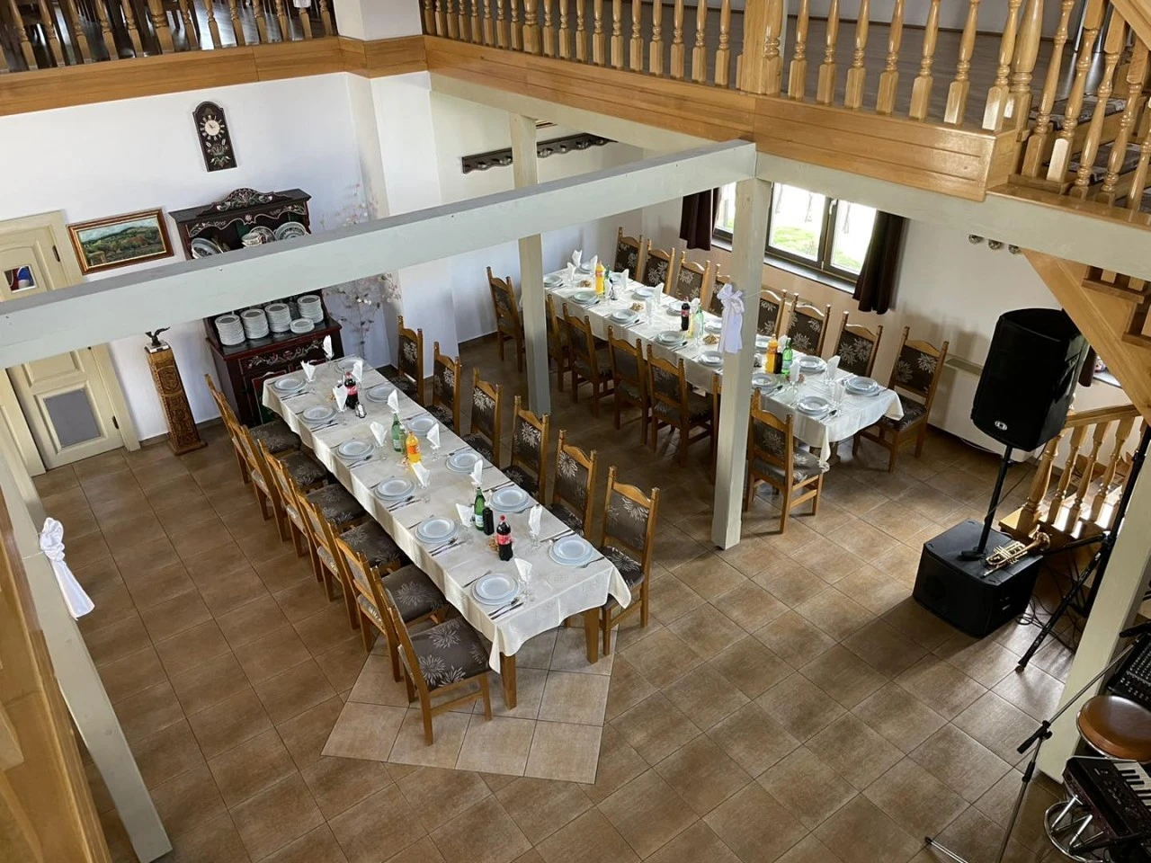 - Sala de mese spațioasă, decorată cu mobilier tradițional, și galeria acesteia sunt perfecte pentru organizarea de evenimente, fie ele familiale sau corporate.