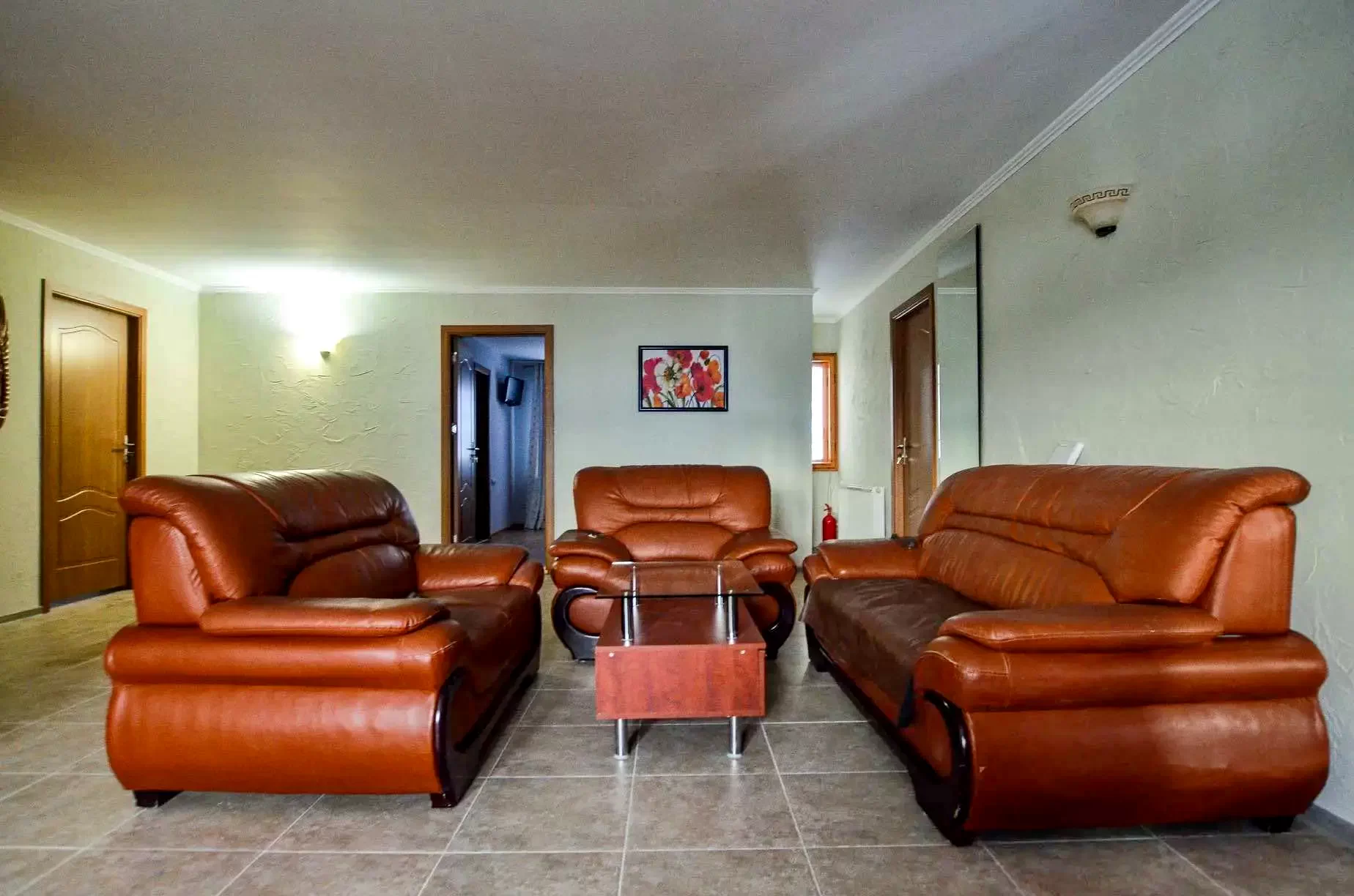 Dotări: TV LCD în fiecare cameră, 2 livinguri de 45 m² cu canapele de piele, 2 terase acoperite, încălzire centrală, 2 săli de mese de 25 m², bucătărie complet utilată