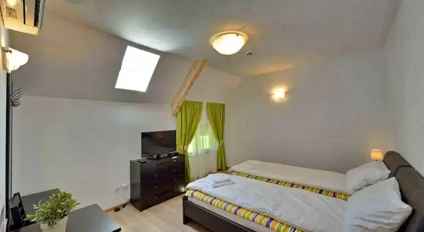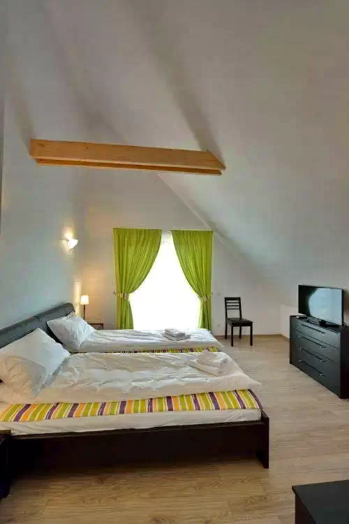 - 2 suite duble - pentru 2 adulti + 2 copii (pat matrimonial + 2 paturi single la mansarda)