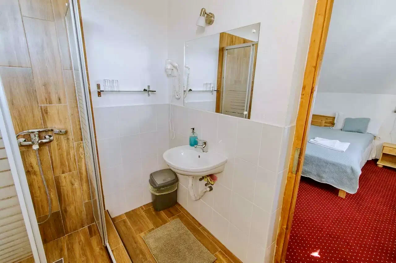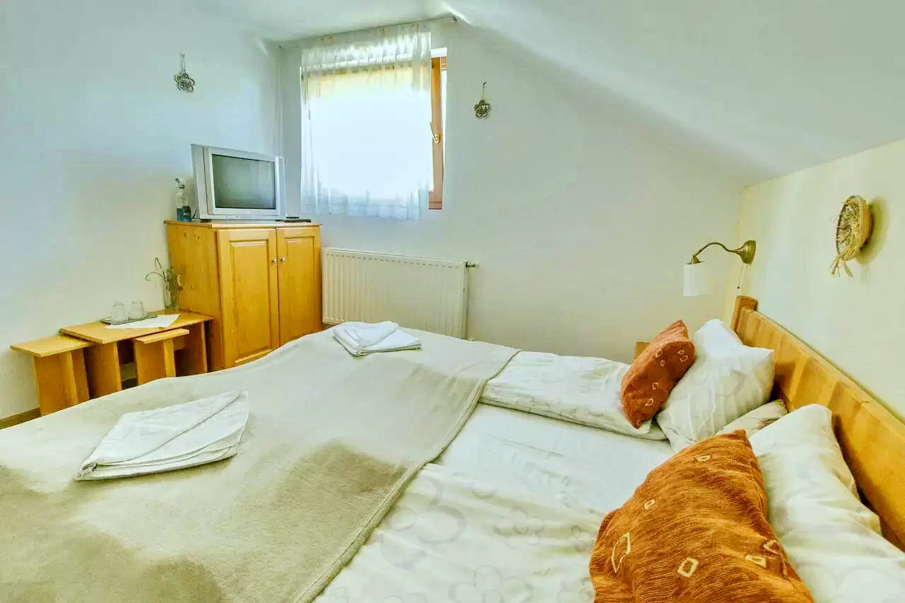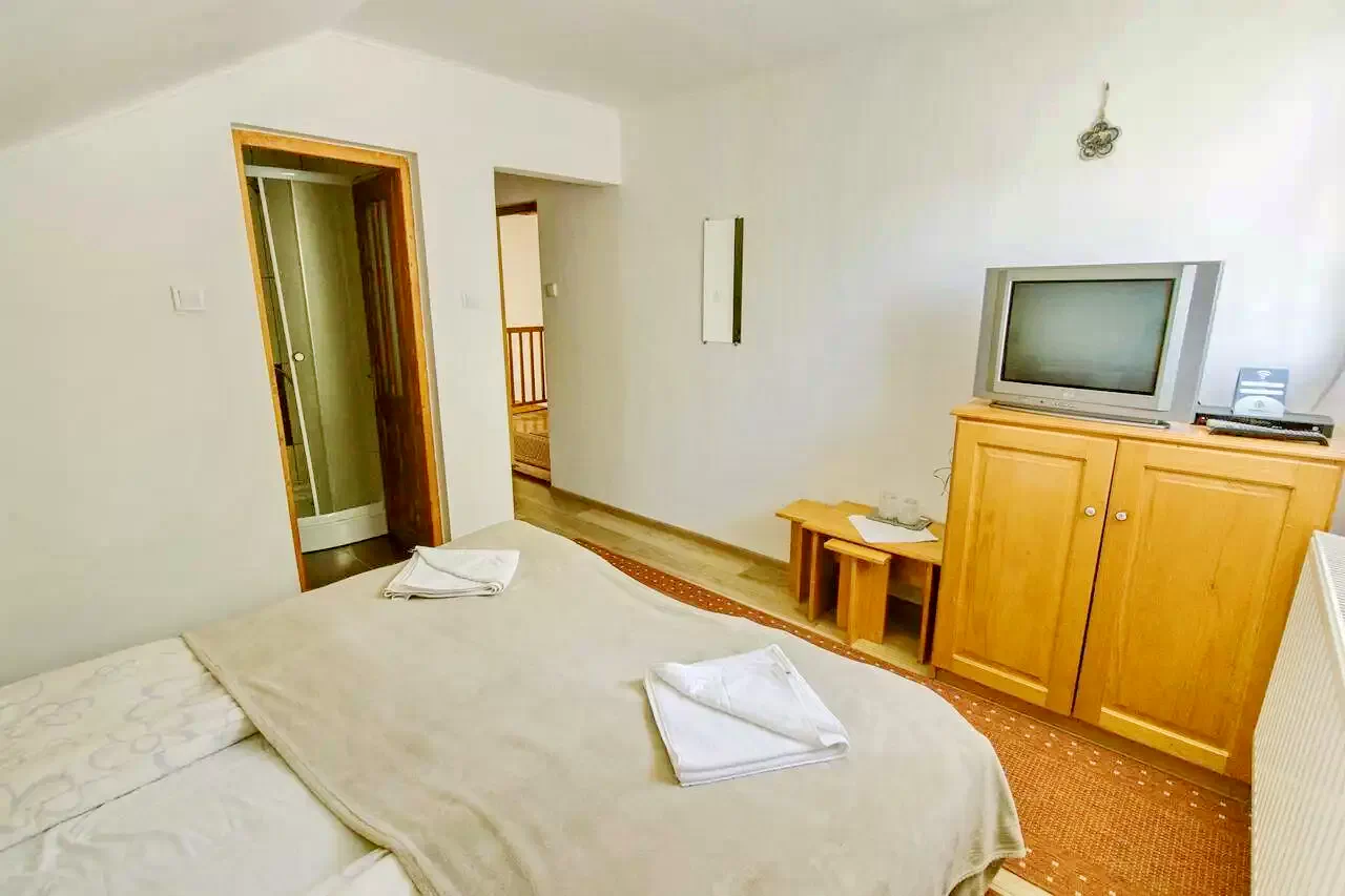 - Fiecare cameră este dotată cu baie proprie şi un televizor, totodata aveţi la dispoziţie lenjerie de pat şi prosoape.