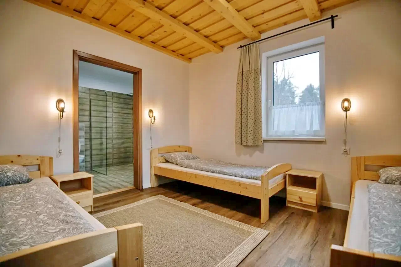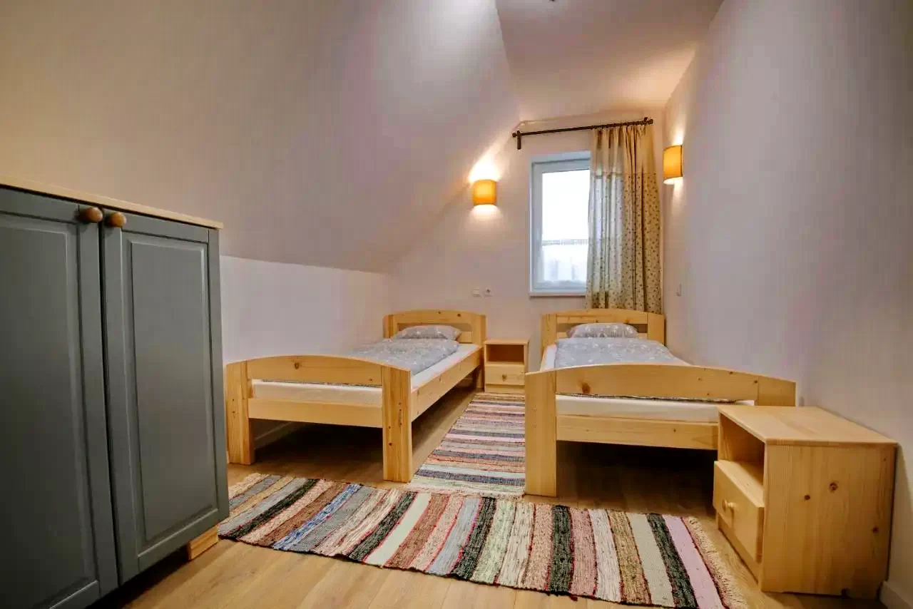 - La etaj, trei camere confortabile și o baie comună (duș, WC, chiuvetă) așteaptă oaspeții. Prima și a doua cameră dispun de două paturi single fiecare, iar a treia cameră include un pat matrimonial și două paturi single, cu baie proprie.