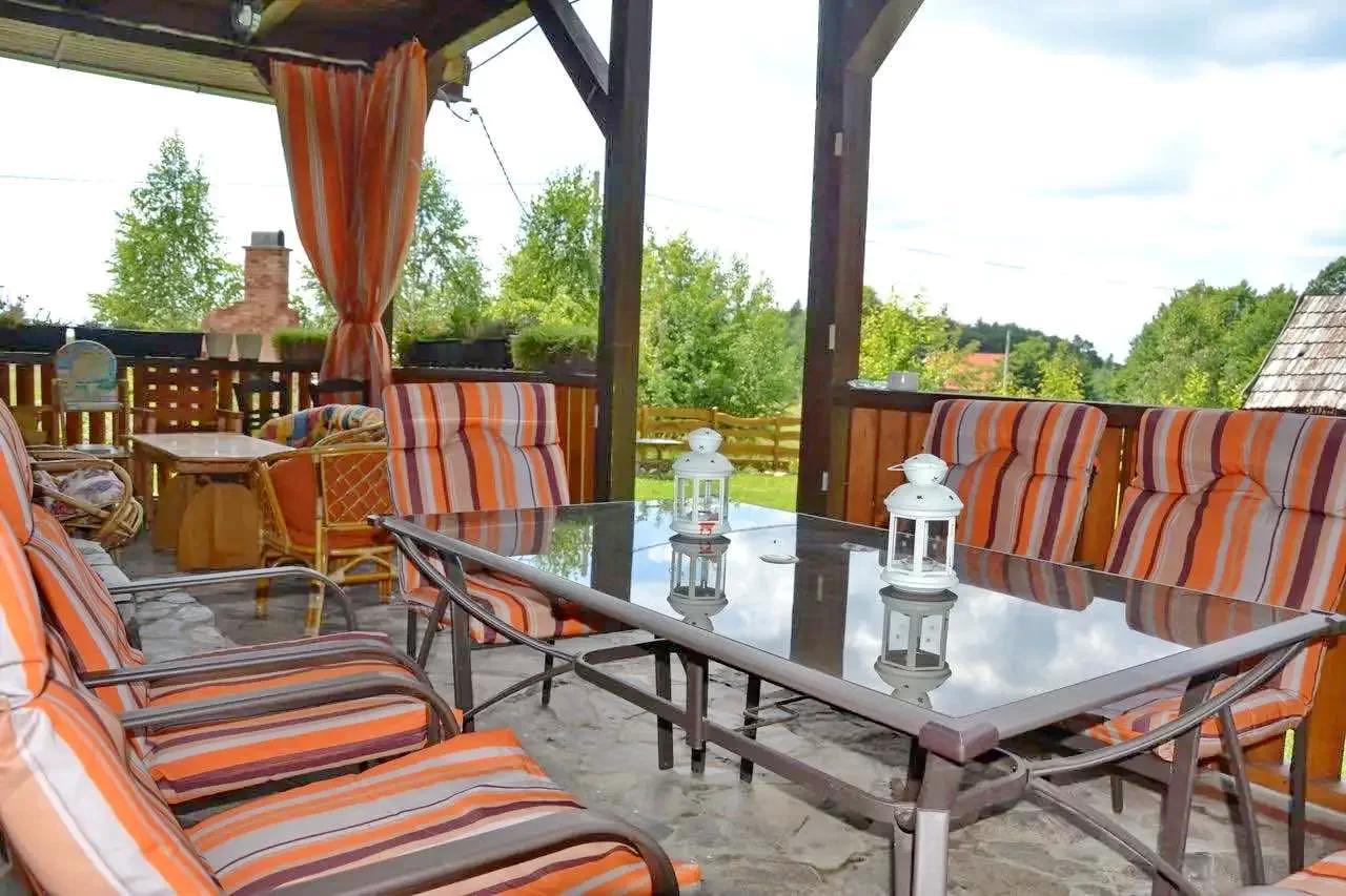 Grădină de vară: Foișor, mobilier de grădină, grătar, ceaun, cuptor tradițional pentru pâine.