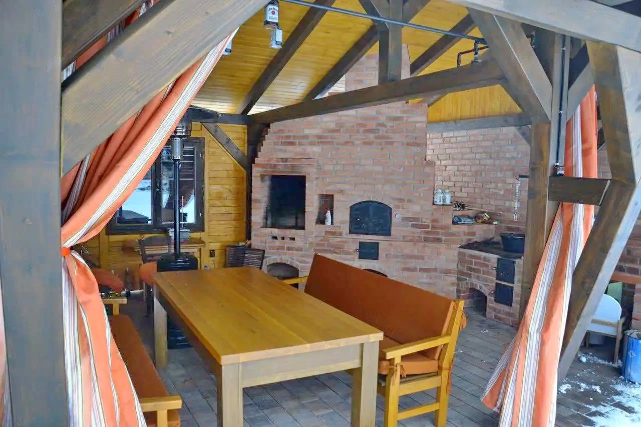 Cazare Izvoare Cabană | Bucătărie, sală de mese, șemineu, living, masă, Wi-Fi, terasă, curte (2000 m²), foișor, grătar, ceaun, loc de joacă, parcare | 8 km Barajul Zetea, 11 km pârtia de schi Harghita Mădăraș, 25 km Odorheiu Secuiesc