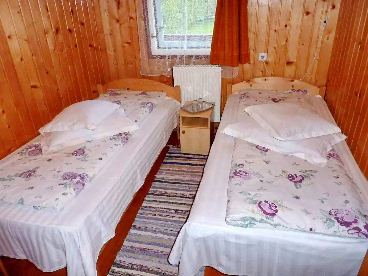 - La etajul doi sunt patru camere: una cu baie proprie (un pat dublu și un pat simplu), trei camere (două cu câte două paturi simple, una cu un pat dublu) cu baie comună pe coridor. O sală de mese separată, spațioasă, asigură confort suplimentar pentru grupuri mari.