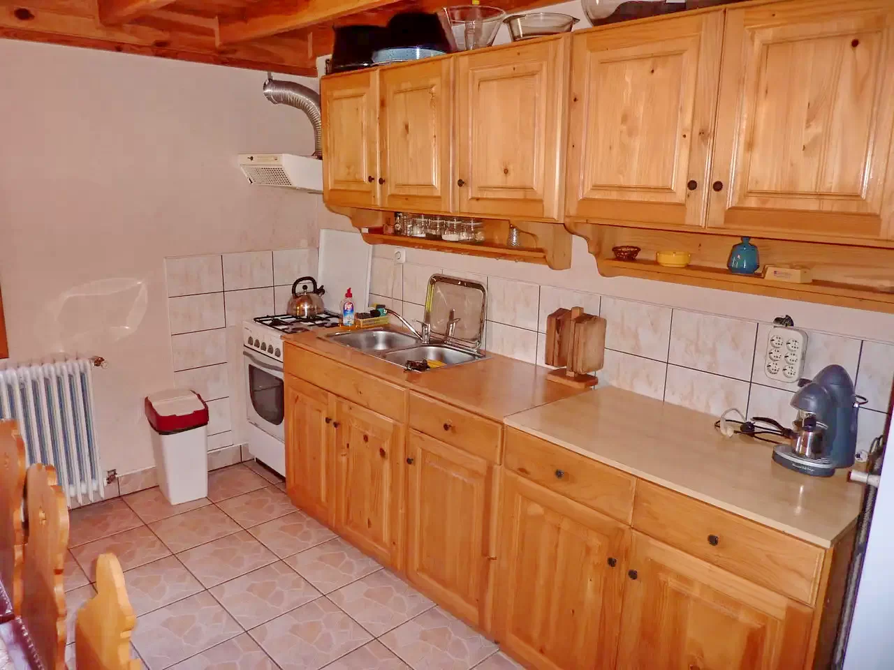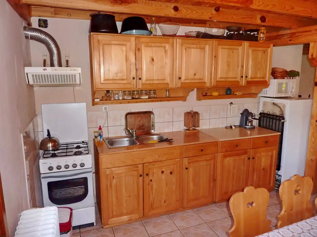 Bucătăria este complet utilată, iar gătitul se face cu gaz din butelie.