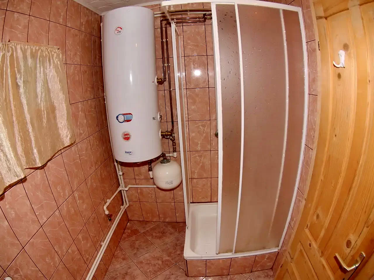 - La etaj sunt trei camere și o altă baie: prima cameră cu un pat dublu și două paturi simple, celelalte două camere cu câte două paturi simple.