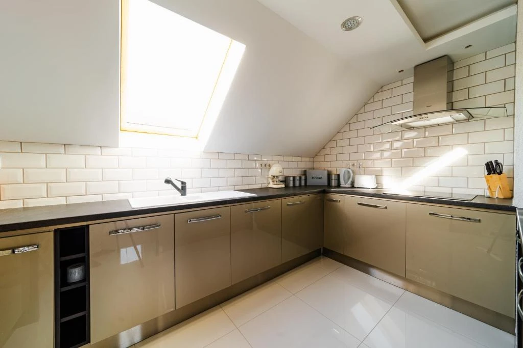Echipamente moderne de bucătărie: espressor, cuptor, plită, cuptor cu microunde, mașină de spălat vase