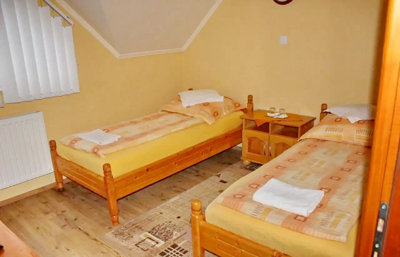 - Etaj: 7 camere (4 duble, 3 triple) – dintre care una dublă are baie interioară privată, celelalte 6 camere folosesc 3 băi cu duș pe coridor, vizavi de camere.