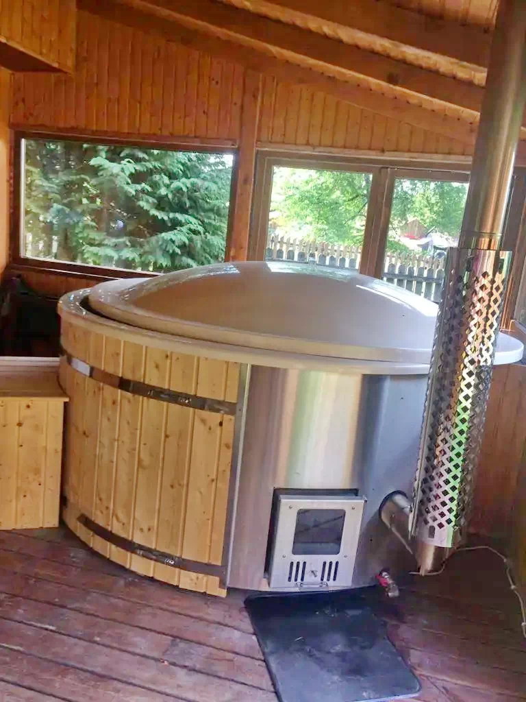 - În curtea pensiunii se află un bar și, pe malul pârâului, cinci căsuțe din lemn izolate termic, fiecare având două paturi, o galerie pentru copii, o baie, o măsuță, un dulap și un televizor.