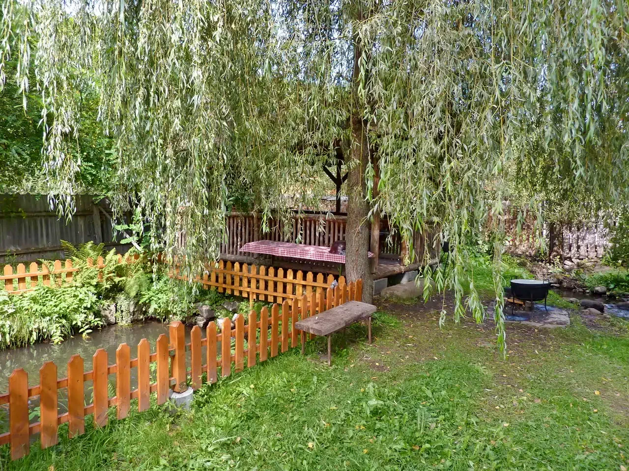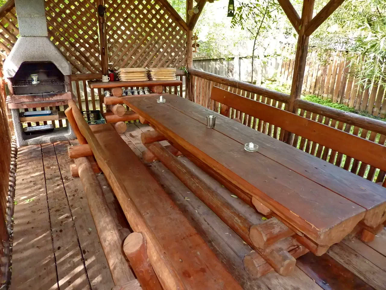 - Curtea de 1000 m² – împărțită cu o altă cabană și locuința proprietarilor – include un foișor acoperit, terasă, grătar, cuptor tradițional pentru pâine, loc pentru foc, ceaun și disc pentru fripturi.