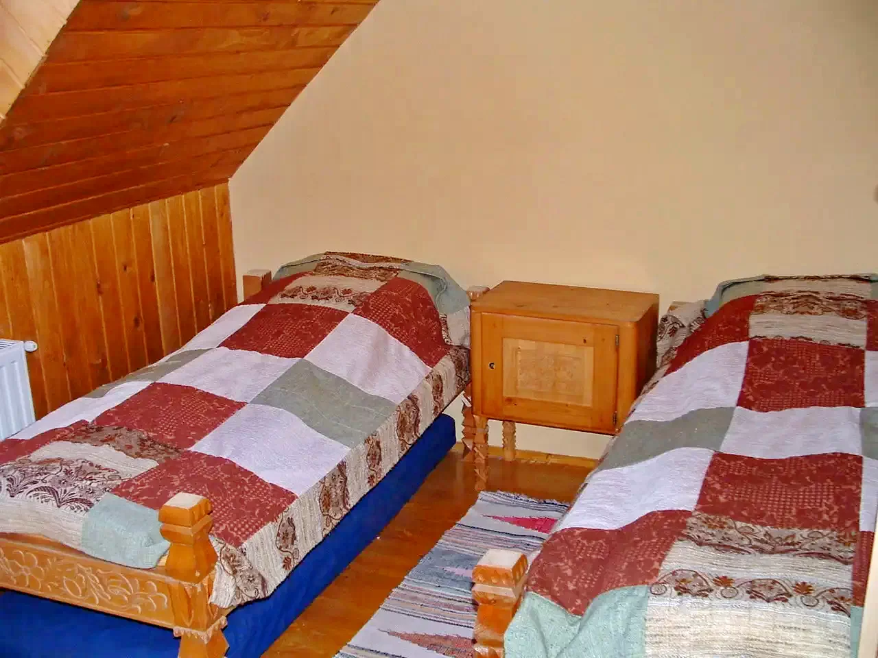 - La etaj, accesibil printr-o scară ușor abruptă, se găsesc două apartamente. Fiecare apartament include două camere în spațiu deschis (fiecare cu un pat matrimonial, pentru 2 persoane) și o baie proprie (duș, WC, chiuvetă).