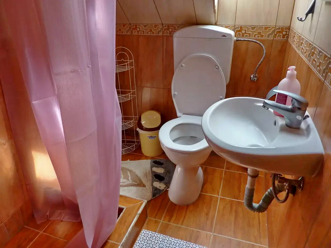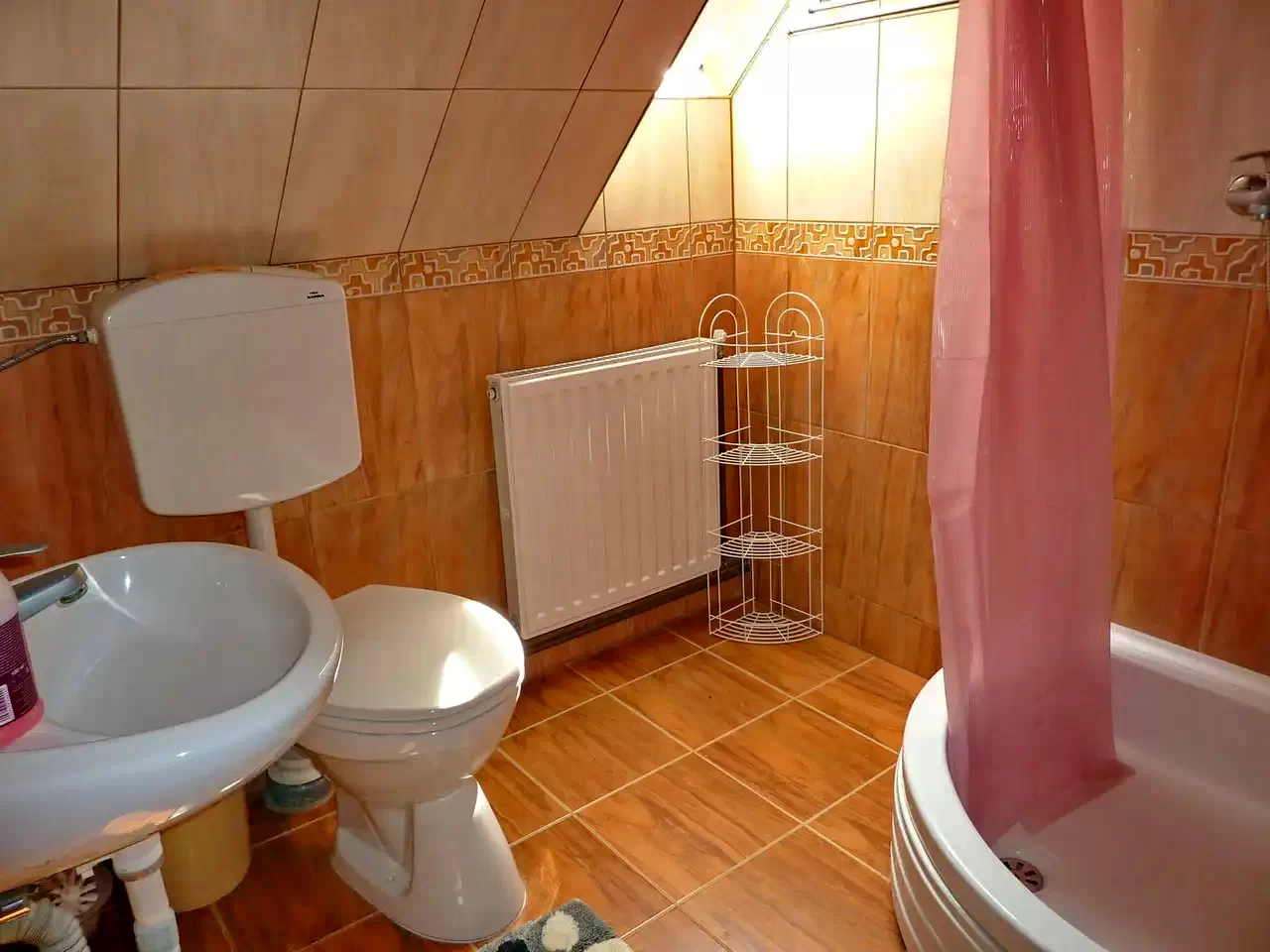 Etaj: 2 apartamente, fiecare cu 2 camere în spațiu deschis (fiecare cu 1 pat matrimonial) și 1 baie proprie (duș, WC, chiuvetă), accesibile printr-o scară abruptă.