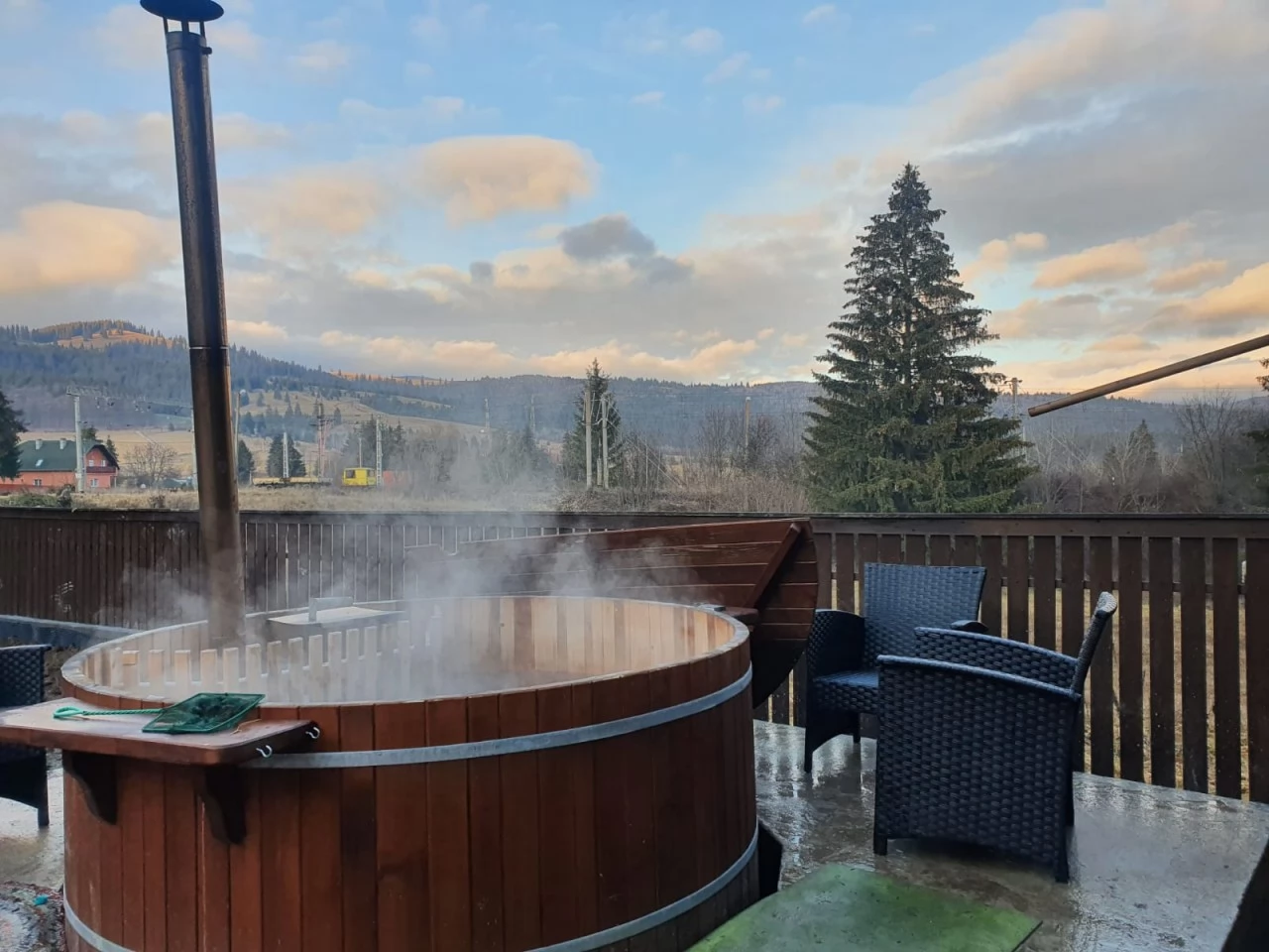 Dispune de bucătărie comuna dotata, oferă lounge comun cu tv si șemineu si terasa.