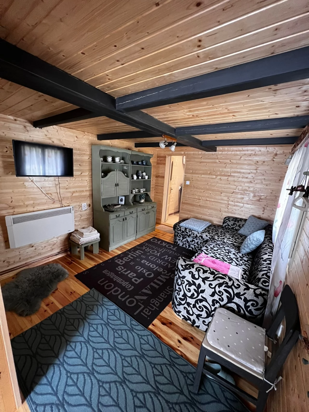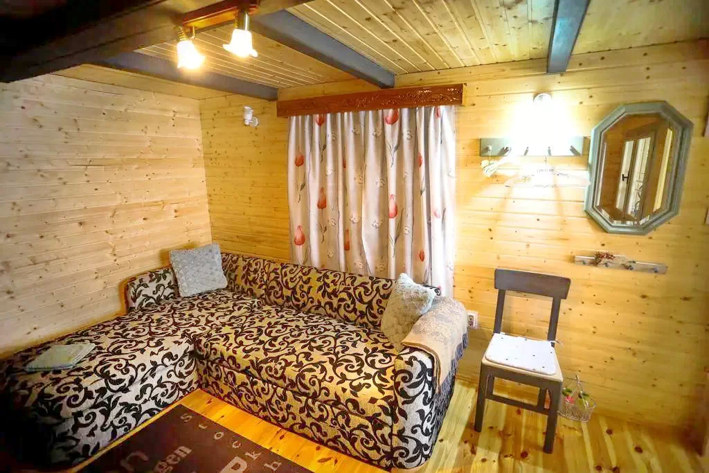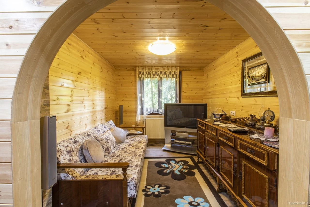 - La parter există o bucătărie, o baie, o cameră de zi și o cameră TV cu un pat extensibil.
