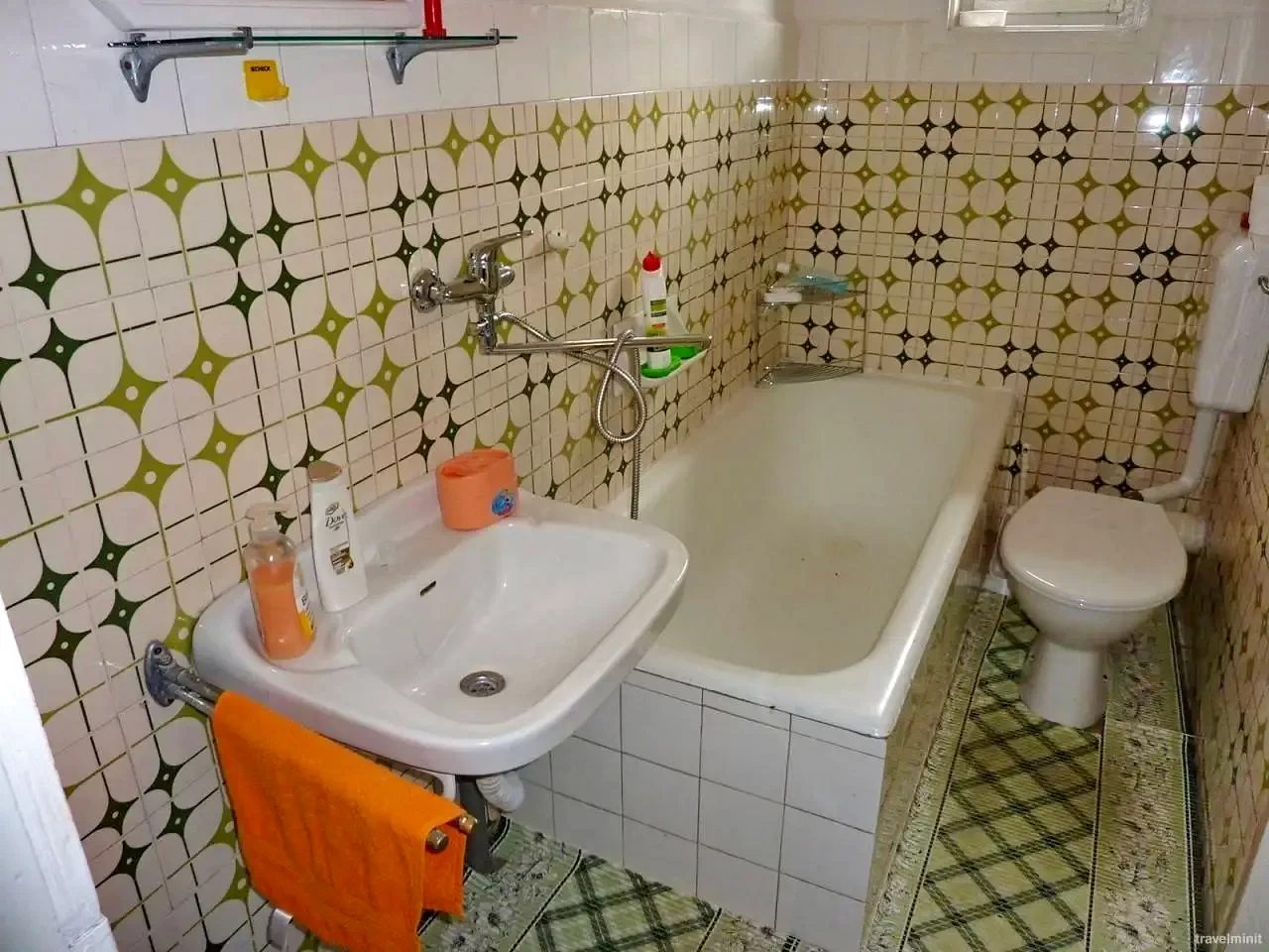 - La primul etaj, accesibil printr-o scară exterioară, se găsește un antreu, un living cu televizor, o baie (cu cadă, chiuvetă și WC) și două camere.