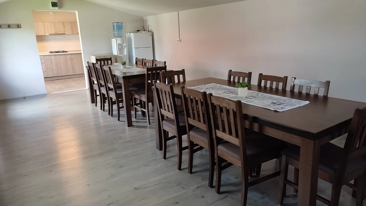 - La parter se află livingul-sufragerie, bucătăria complet utilată și trei camere (două camere de 4 locuri și una de 2 locuri).