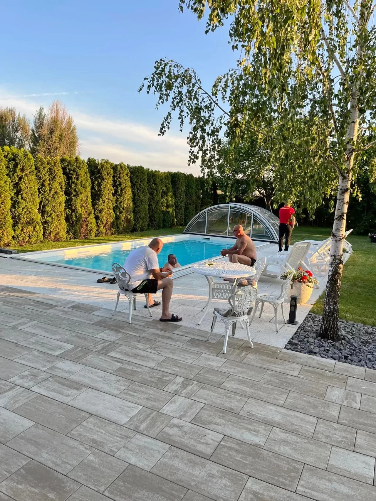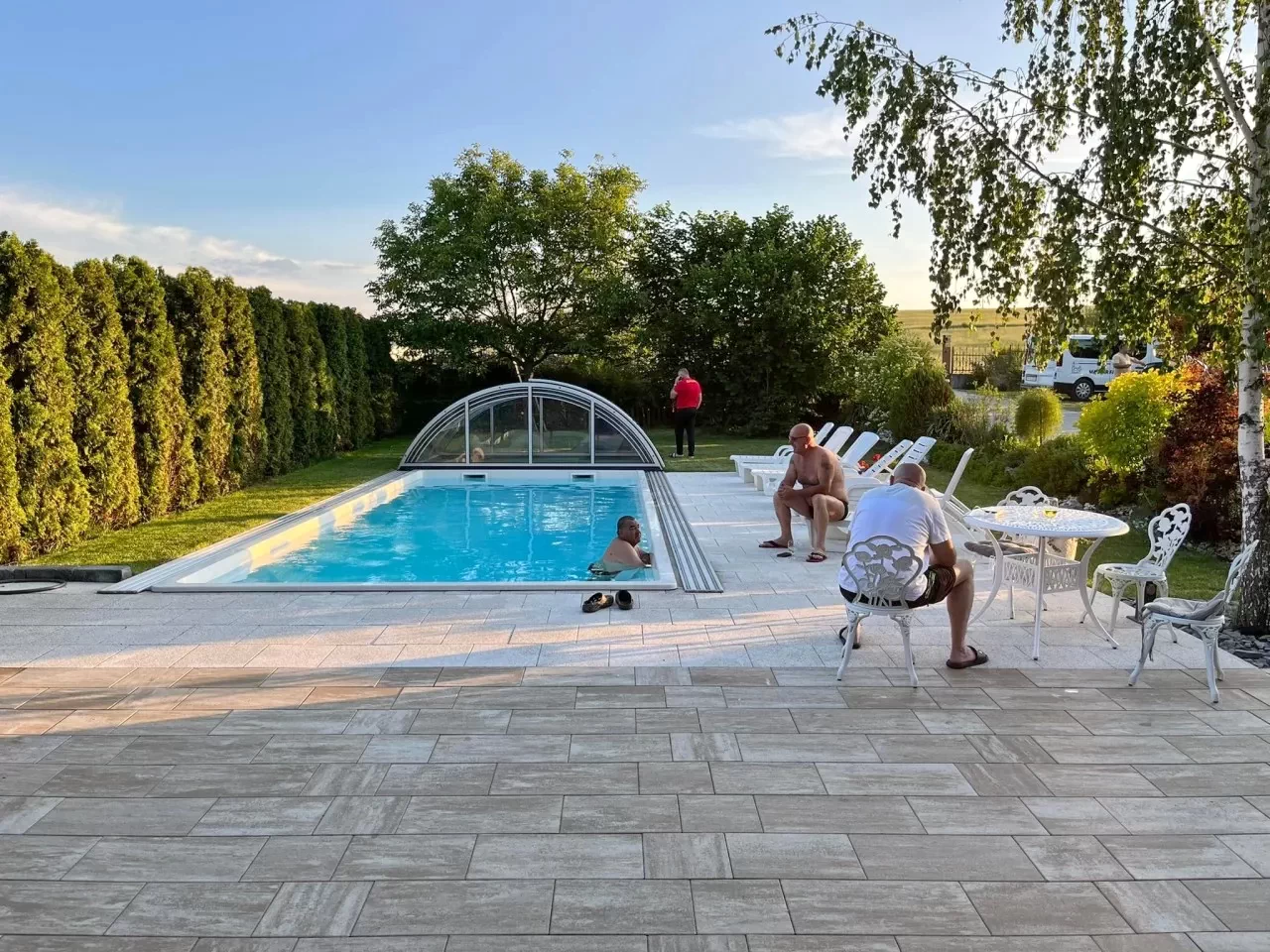 - Curtea imensa cu piscina si ciubar este dotat cu mobilier de gradina (foisor, gratar, ceaun, loc de joaca pentru copii), locuri de parcare pentru autoturisme, si autobuze.